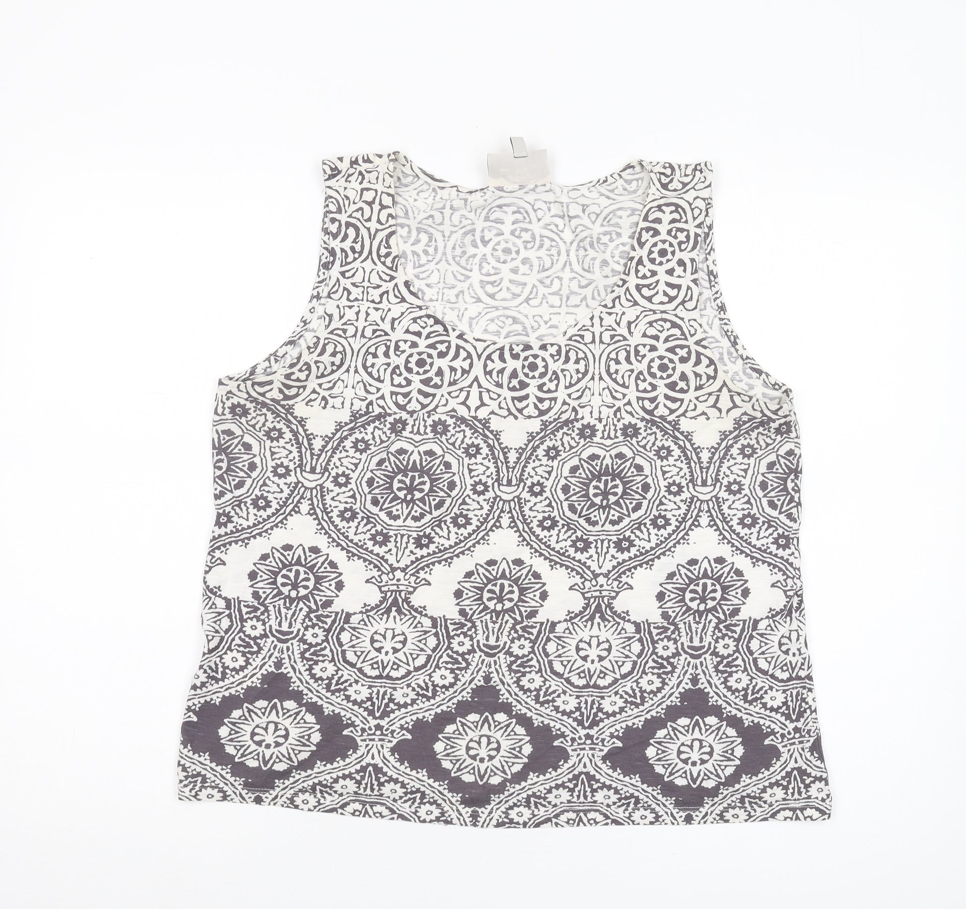 Elevate your casual wardrobe with this chic Laura Ashley women's tank top in a versatile grey. Crafted from 100% cotton, this piece offers ultimate comfort for any casual occasion. Its sleeveless design and scoop neckline provide a classic look, perfect for layering or wearing alone during warmer days. The regular fit and regular size type ensure a flattering silhouette that suits various body types. Featuring a unique geometric pattern, this top is made from jersey fabric, giving it a soft texture and a relaxed feel. Ideal for women seeking a stylish yet comfortable addition to their clothing collection, it embodies both simplicity and elegance. Easy to care for with its machine washable nature, it remains a practical choice for everyday wear. Despite being in excellent condition, this pre-loved tank top displays no visible wear or damage, making it a wonderful addition to any fashion-forward wardrobe. Whether paired with jeans or a skirt, the Laura Ashley tank offers a subtle touch of style. Available in UK size 16, this geometric patterned tank suits a variety of casual occasions, providing a timeless and versatile option for your outfits.