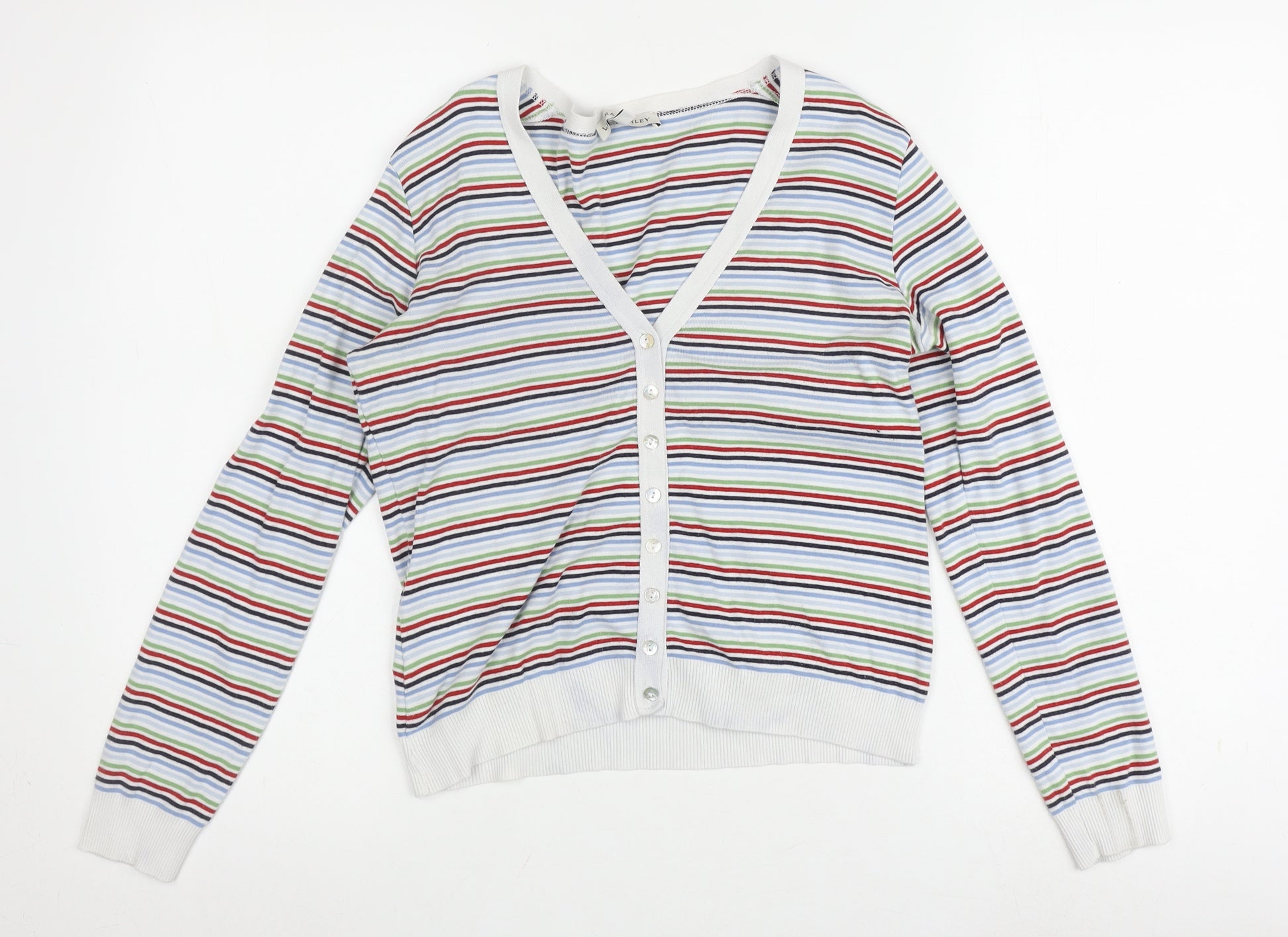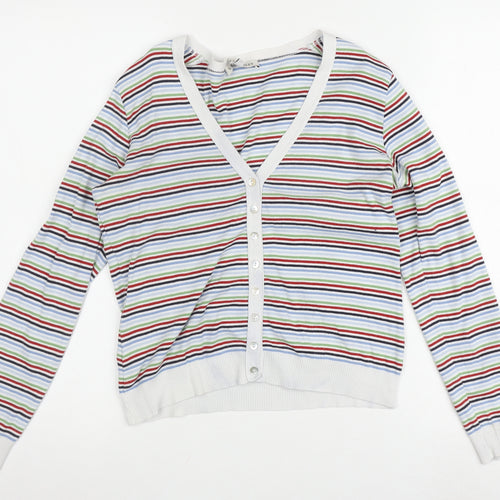 Elevate your wardrobe with this chic Laura Ashley women's cardigan in a vibrant multicoloured stripe pattern. Perfect for both spring and autumn, this regular fit, machine washable cardigan promises both style and comfort. Featuring a flattering V-neckline and long sleeves, it is ideal for casual outings. Crafted entirely from soft cotton and adorned with a classic button accent, this cardigan embodies the quintessential mix of practicality and fashion. A must-have collection piece for any woman seeking a versatile yet striking wardrobe addition that seamlessly blends classic Laura Ashley elegance with contemporary flair. Don't miss the chance to own this exquisite cardigan priced attractively for its excellent condition.