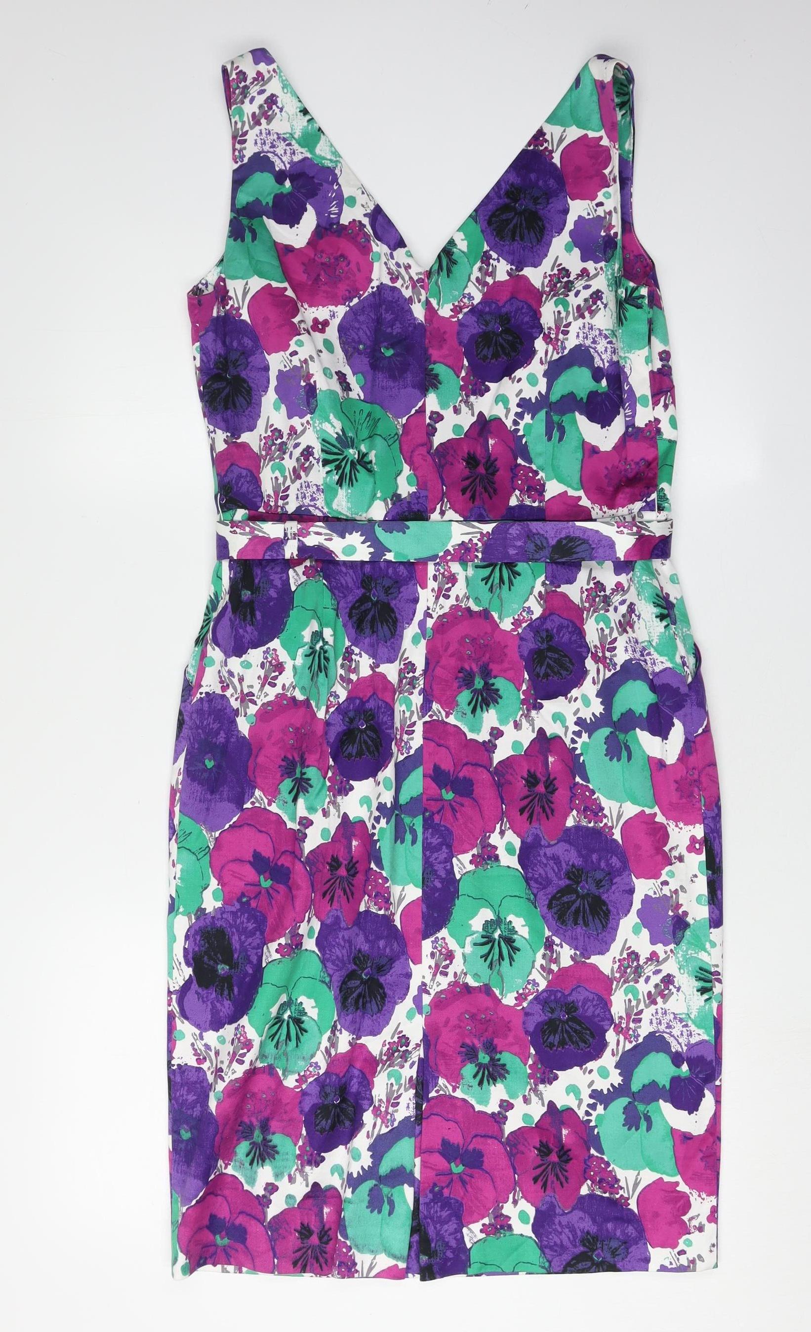 Discover elegance with this Laura Ashley Women's Floral Dress, perfect for any formal occasion. This multicoloured ensemble features a vibrant floral pattern that adds a splash of colour and charm to your wardrobe. Crafted from a comfortable blend of cotton and elastane, it ensures a flattering and flexible fit. The dress is sleeveless and accented with a stylish belt, highlighting an exquisite V-neckline. Ideal for events that require a touch of sophistication, this dress is both chic and versatile. With its woven fabric and seamless zip closure, it promises easy wear and effortless style. Don't miss out on this pristine condition piece, ready to enhance your collection with its modern yet timeless design.