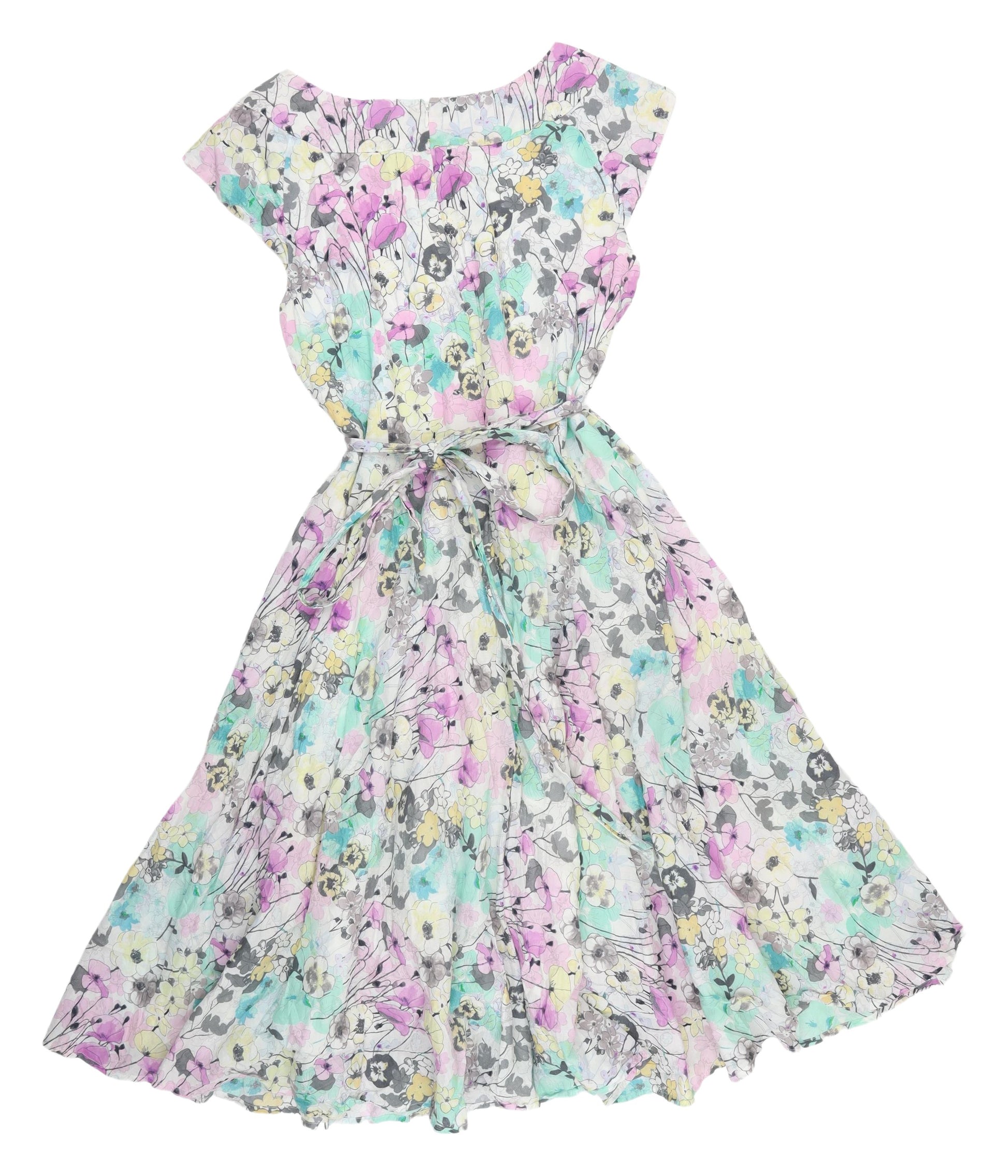 Welcome the charm of spring and summer into your wardrobe with this captivating Laura Ashley floral dress, a perfect blend of style and comfort. Crafted from 100% cotton, this lightweight dress is ideal for warm weather. The vibrant floral pattern in a beautiful array of multicolours exudes a timeless, fresh appeal that is perfect for casual outings or garden parties. Featuring a flattering fit and flare style, the dress elegantly accentuates the waist with a matching belt, adding a sophisticated touch to your ensemble. The sleeveless design with delicate cap sleeves and a boat neckline enhances its graceful silhouette, making it a versatile piece for any sunny day. Designed for the nature-loving fashionista, this dress evokes the essence of spring with its exquisite floral motif, capturing attention wherever you go. The dress is machine washable, ensuring effortless garment care, while the fully lined interior promises a comfortable wearing experience. Although pre-loved, it is in excellent condition with vibrant prints and minimal signs of wear, offering a chic upgrade for your seasonal collection at an affordable price. Whether you're strolling through a park, attending a casual lunch, or simply relishing a day out, this Laura Ashley dress adds a dash of elegance to your look. The enchanting florals and the classic fit & flare silhouette ensure you step out in style, every time.