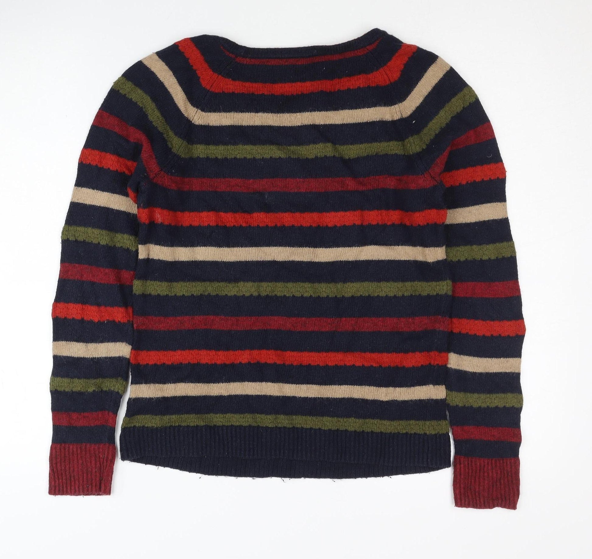 Step into effortless style with the Laura Ashley Women's Multicoloured Striped Pullover Jumper, perfect for adding a splash of colour to your wardrobe. Expertly crafted with a luxurious blend of cotton, viscose, nylon, and yak, this jumper offers both comfort and warmth, making it ideal for the cooler seasons of autumn and winter. The eye-catching striped pattern in a variety of vibrant hues adds a touch of playfulness to any outfit. Featuring a classic round neck and full-length raglan sleeves, this knit pullover ensures a relaxed, comfortable fit while maintaining a chic silhouette. Designed for everyday versatility, this jumper is perfect for casual outings, pairing beautifully with jeans or a skirt for a laid-back, fashionable look. Despite being used, this piece is in excellent condition with only slight pilling, ensuring you can enjoy it for many seasons to come. Make room in your collection for this timeless piece and experience the quality and elegance of Laura Ashley. With machine washable care, maintaining its fresh appearance is a breeze. Elevate your style effortlessly with this stunning piece from a trusted brand.
