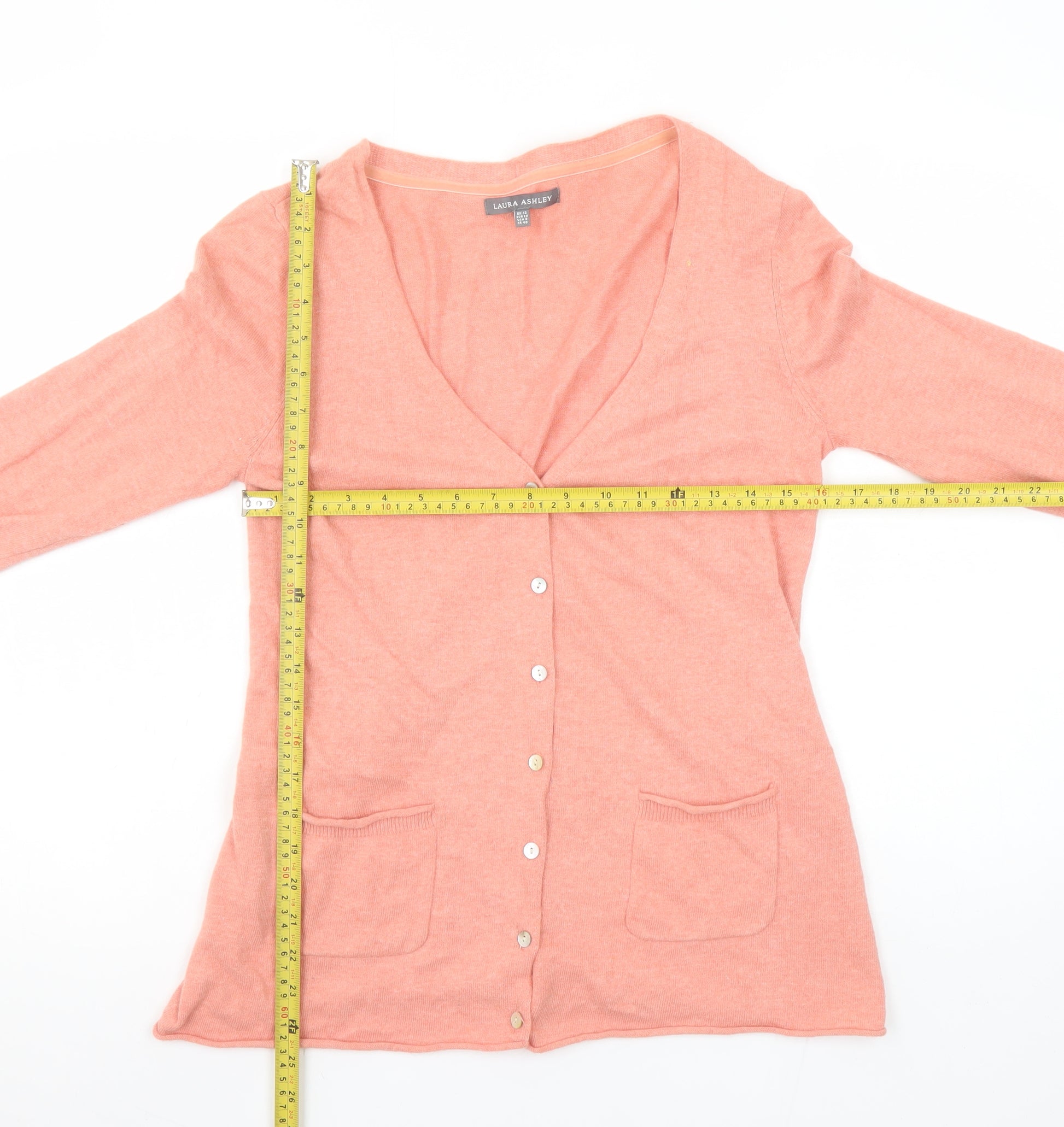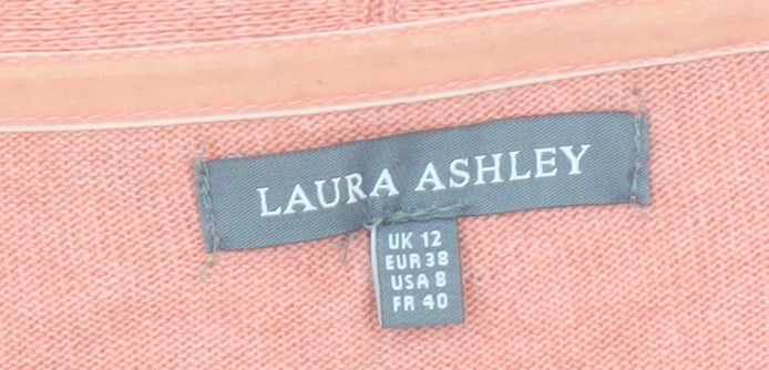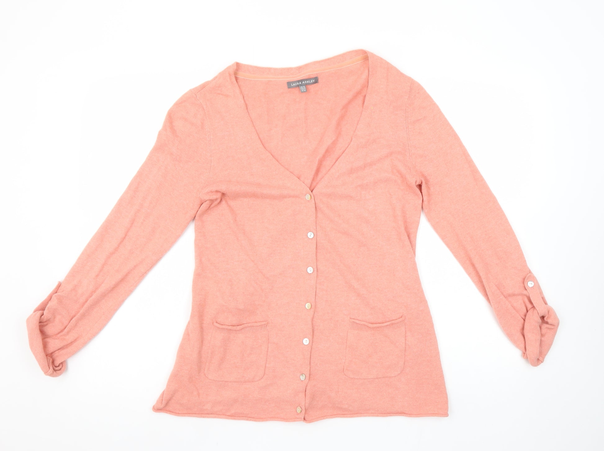 Add a touch of timeless charm to your wardrobe with this Laura Ashley women's cardigan in a soft pink shade. Crafted from a comfortable blend of cotton, viscose, nylon, and angora, this knit is smooth to the touch and perfect for layering during transitional seasons like spring and autumn. The cardigan features a flattering V-neckline, long sleeves with roll tab details, and a front button fastening that adds a classic touch to its simple, elegant silhouette. Twin front patch pockets offer subtle functionality while maintaining its lightweight and refined appearance. Designed in UK size 12, this cardigan provides a regular fit suitable for effortless styling, whether layered over a blouse for a daytime outing or paired with jeans for a relaxed, off-duty look. Ideal for casual and everyday wear, it combines softness, breathability, and a hint of luxury from the angora content. The tight-knit finish ensures durability and a stylish drape, making it a versatile addition to your knitwear collection. Gently worn but in excellent condition, this cardigan showcases quality craftsmanship and Laura Ashley’s signature blend of heritage and modern femininity. It’s a wardrobe staple with comfort and charm, offering the perfect balance of practicality and understated elegance. Enhance your seasonal style effortlessly with this beautiful pink Laura Ashley cardigan.