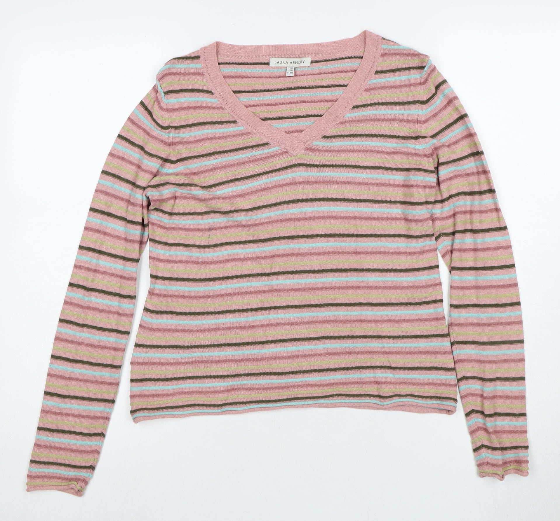 Elevate your wardrobe with this chic and comfortable Laura Ashley women's jumper. Perfect for casual everyday wear, this pink pullover features a stylish V-neckline and a flattering fit. Crafted from a blend of cotton, viscose, and linen, this jumper promises comfort and breathability. Its lightweight, tight-knit design, along with cheerful striped pattern, makes it an ideal choice for all seasons. Whether you pair it with jeans for a laid-back look or dress it up with a skirt for a coffee date, this versatile jumper will become a staple in your collection. The long sleeves provide coverage for cooler days while the regular fit ensures a comfortable wear. Machine washable for easy care, this piece is in excellent condition, lightly worn with no visible damage. Grab this pretty pink jumper to treat yourself to some cozy elegance and step out in style.