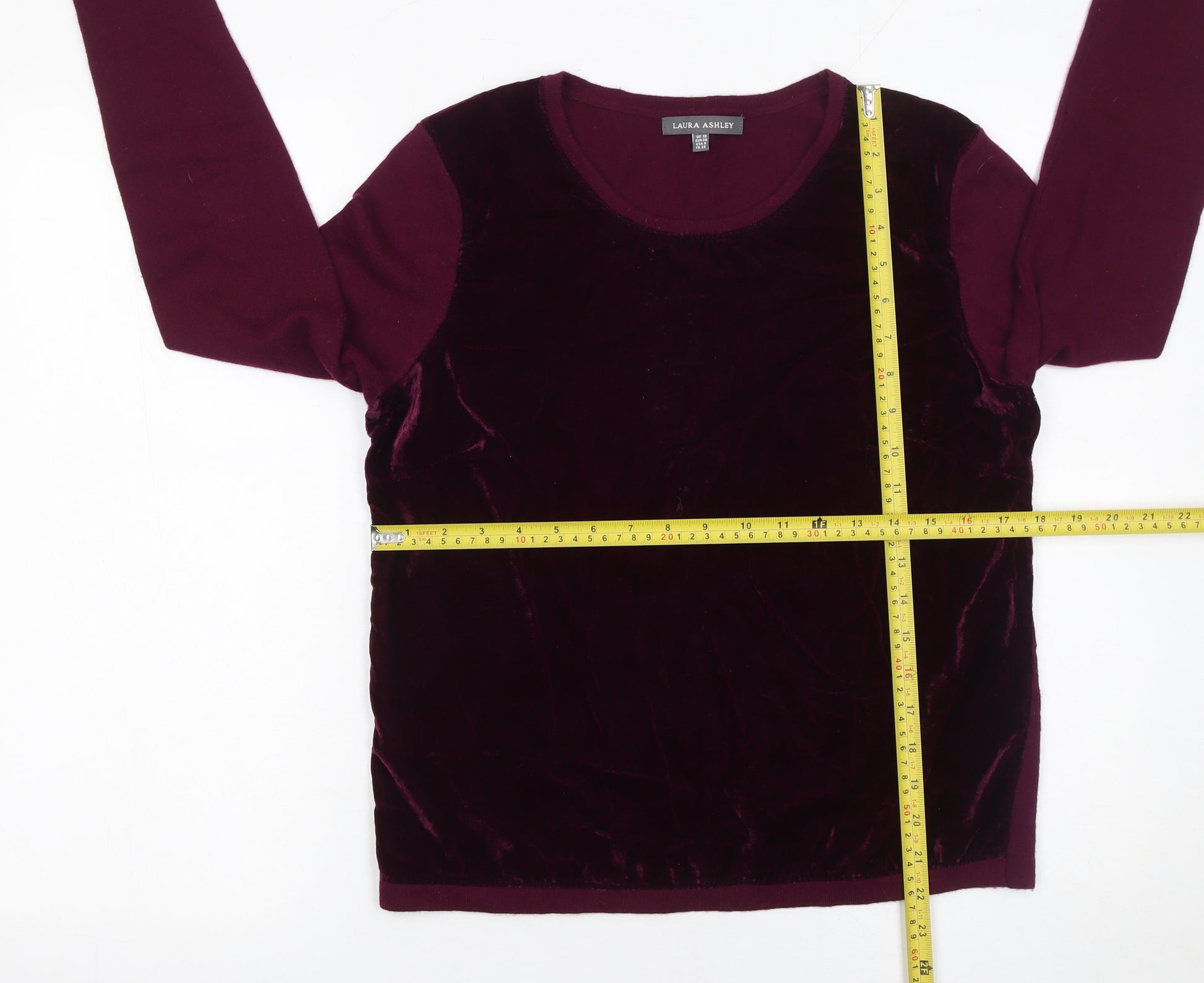 This stunning Laura Ashley women’s jumper brings together classic style and luxurious comfort. Crafted from a premium blend of viscose, wool, nylon, and a touch of cashmere, it delivers softness, breathability, and warmth—perfect for cool autumn or winter days. The rich purple tone adds a refined touch to any wardrobe, while the velvet front panel creates a sophisticated textural contrast that elevates its look from everyday to effortlessly elegant. Designed with a flattering round neckline and long sleeves, this pullover-style jumper offers a relaxed yet feminine silhouette that drapes beautifully over the body. The jumper’s tight-knit construction ensures warmth and durability without bulk, making it ideal for layering over shirts or wearing alone for a polished finish. The lightweight yet insulating material makes it versatile and comfortable to wear throughout the seasons.Whether paired with trousers for a smart-casual office outfit or styled with jeans and ankle boots for a weekend look, this Laura Ashley piece embodies timeless British design and quality craftsmanship. The wool and cashmere components lend natural softness and thermal properties, while the viscose and nylon provide shape retention and a smooth touch against the skin.Conditioned in excellent pre-owned state with minimal signs of gentle wear, it retains its original colour and sumptuous feel. This jumper is a brilliant choice for anyone seeking a cozy wardrobe favourite with a refined edge. Combining comfort, texture, and timeless colour, it’s an ideal choice for both casual outings and relaxed evenings.A perfect addition to any stylish woman’s autumn and winter collection, this Laura Ashley jumper is as practical as it is beautiful—an easy way to add effortless sophistication to everyday ensembles.