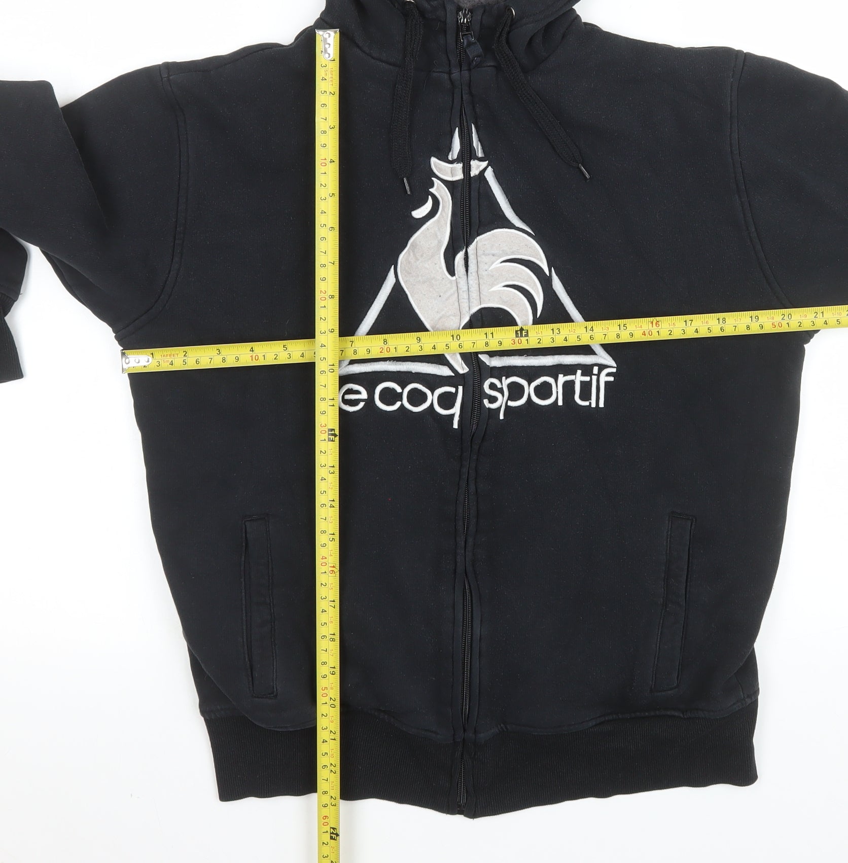 This Le Coq Sportif men's black hooded jacket is a classic casual outerwear piece ideal for sport, travel, and everyday wear. Made from a soft and durable blend of 65% polyester and 35% cotton, it offers warmth and comfort while remaining breathable. The full zip front and ribbed cuffs ensure a snug fit, while the attached hood with drawstrings provides extra protection against cool weather. Designed for versatility, this mid-length jacket features two front pockets for practical storage, a bold embroidered Le Coq Sportif logo on the chest for a sporty finish, and a cosy interior lining that provides warmth in autumn, winter, and early spring. Its regular fit and simple design make it suitable for modern casual wardrobes, whether layering over gym wear or pairing with jeans for a relaxed look. The high-quality material blend gives it lasting shape retention and easy care, being machine washable for convenience. With a stand-up collar and zip closure, this black jacket is versatile for multiple activities such as running, training, or walking. The stylish French brand detailing embodies classic athletic appeal combined with modern streetwear aesthetics. Condition-wise, the jacket is in very good condition with only light signs of wear, showing no major flaws, stains, or damage. Perfect for men seeking comfort, style, and a touch of sporty elegance. Comparable jackets from Le Coq Sportif in similar condition retail around £25 on resale platforms, making this a great-value addition to any casual wardrobe. The combination of soft fleece-like interior, sporty branding, and durable construction ensures longevity and all-day wearability for varying weather conditions, ideal for active or relaxed days alike.