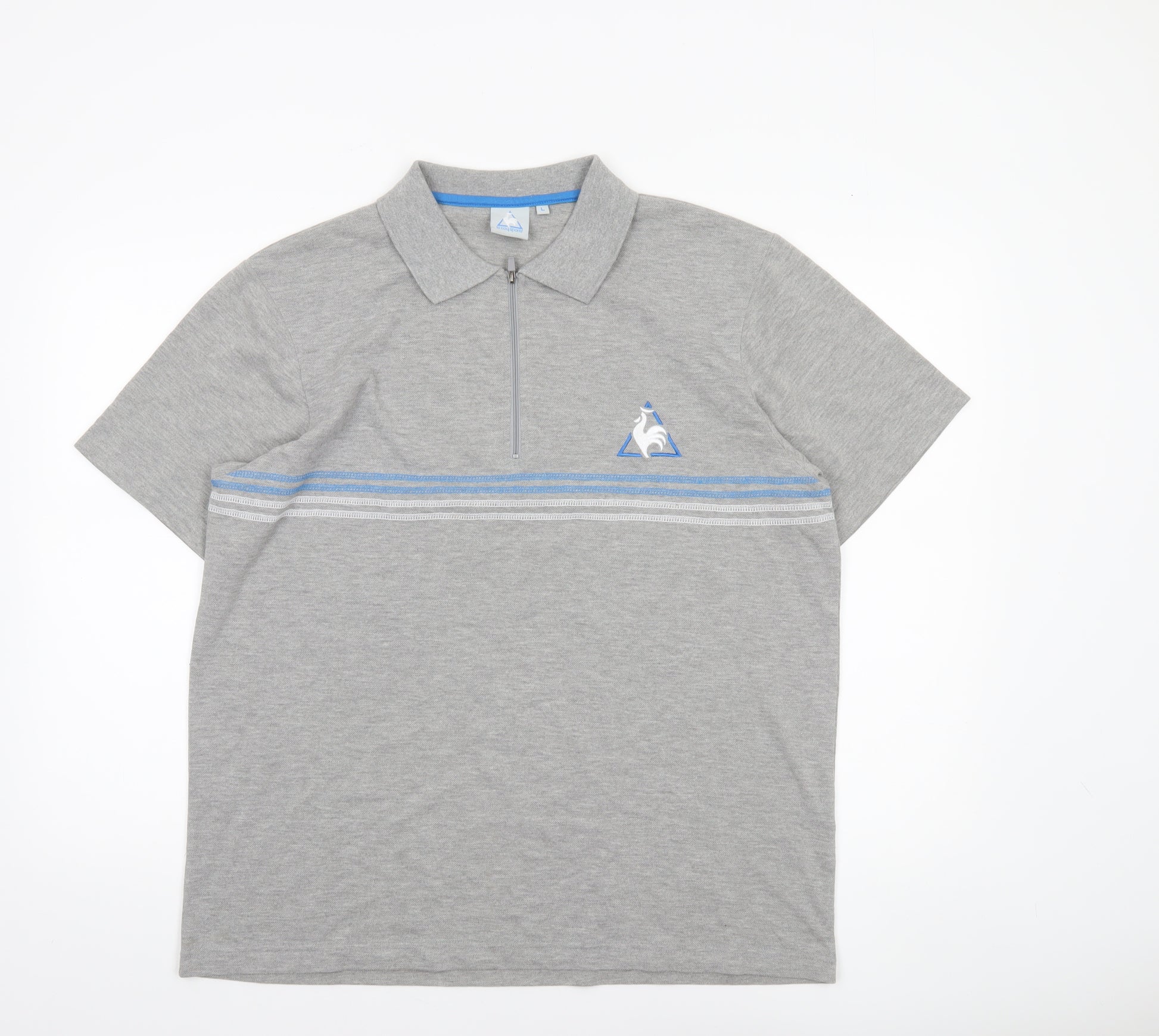 Step out in confident casual style with this Le Coq Sportif Men's Grey Striped Short Sleeve Polo Shirt in size Large. Made by the iconic French sportswear brand, this polo combines understated athletic design with day-to-day wearability. Crafted from a soft and breathable polyester-cotton blend, it feels lightweight while offering lasting comfort whether you’re on the golf course, enjoying a leisurely walk, or heading to a casual outing. The design features a striking grey tone with subtle light blue and white stripe detailing across the chest, providing a timeless sporty look. A smart collared neckline with a 1/4 zip closure adds a modern twist to classic polo styling, while the embroidered Le Coq Sportif logo on the chest enhances its premium appeal. Built for both performance and everyday wear, the blend of 65% polyester and 35% cotton ensures durability and easy care, helping maintain the shirt’s shape and colour even after multiple washes. Its breathable and lightweight fabric makes it perfect for spring and summer wear, providing comfort while keeping you effortlessly stylish. This regular fit polo pairs seamlessly with chinos, shorts, or jeans for a versatile addition to your wardrobe. Whether you’re dressing for a casual office day or a relaxed weekend, this polo delivers a refined yet sporty edge synonymous with the Le Coq Sportif brand. In excellent pre-owned condition with no visible flaws, this polo shirt has been gently worn and carefully inspected for quality. It’s an ideal piece for the man who appreciates comfort, craftsmanship, and understated athletic aesthetics. Upgrade your casual collection with this Le Coq Sportif polo and enjoy comfort and style in one exceptional garment.