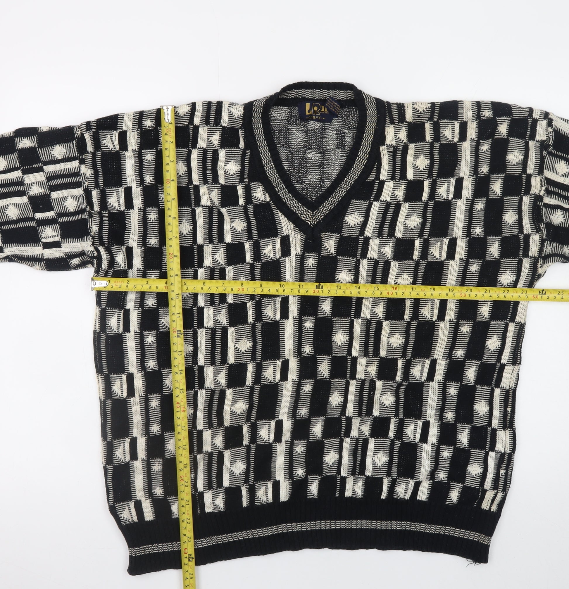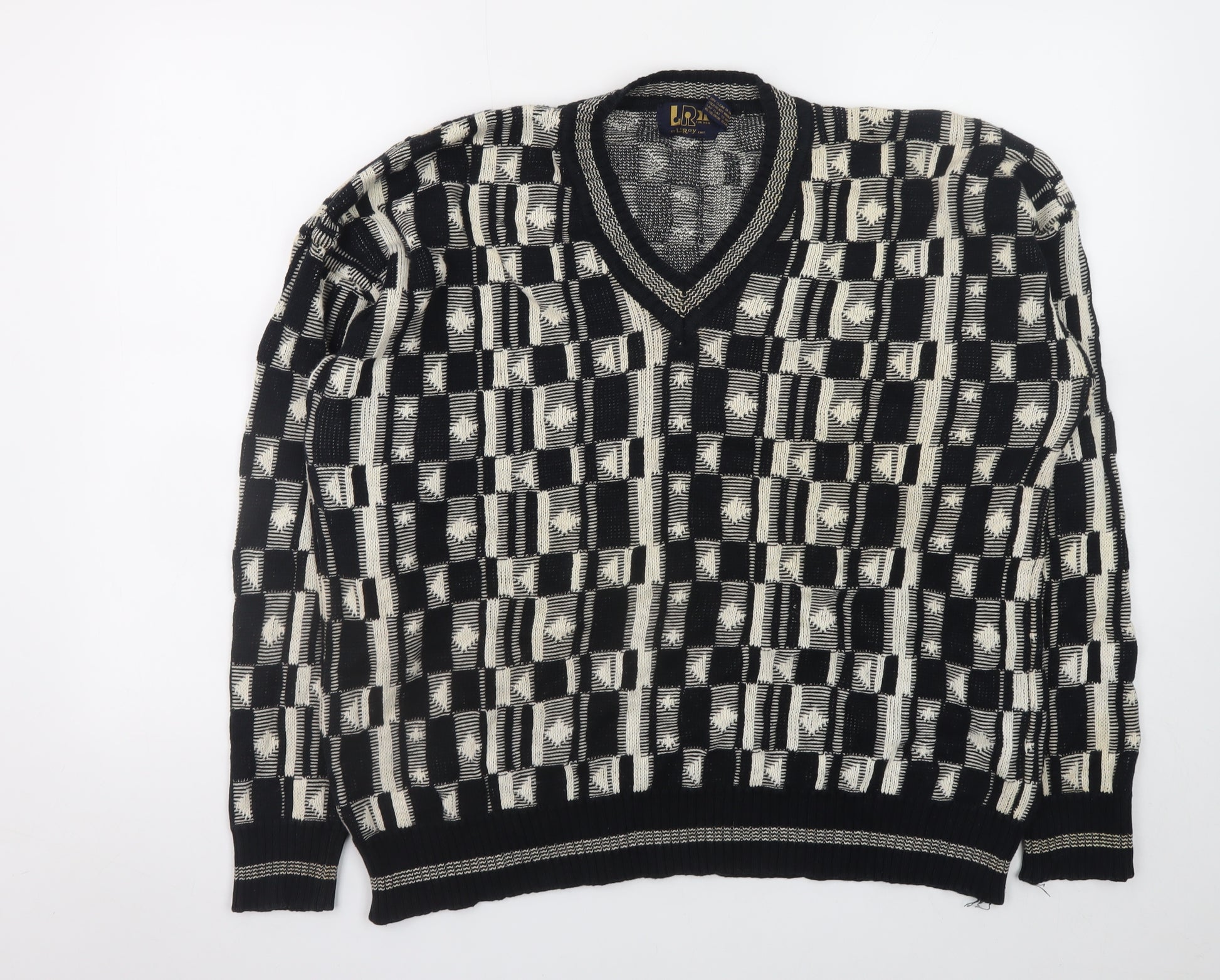 Step back into timeless vintage fashion with this distinctive Le Roy men’s cotton knit pullover jumper. Crafted in a bold black and ivory geometric pattern, this V-neck design is an excellent choice for those who appreciate retro style with a contemporary edge. Made entirely from soft and breathable 100% cotton, it offers both warmth and comfort, ideal for layering during the autumn and winter seasons. The XL size provides a relaxed, regular fit that drapes naturally and complements a variety of casual looks, from jeans to tailored trousers. The chunky-knit texture enhances the premium feel, while the geometric motif adds a striking visual appeal reminiscent of classic 90s fashion. Ribbed hems, cuffs, and neckline ensure structure and shape retention without compromising comfort. Designed for men but perfectly versatile for a unisex wardrobe, this jumper delivers easy styling and durability, ideal for everyday wear. Though vintage, it remains in excellent condition with only light signs of natural wear, reflecting careful previous ownership. Easy to care for and machine washable, this piece will maintain its look and feel season after season. A must-have addition for vintage enthusiasts or anyone looking to add a sophisticated twist to their casual collection, blending character, comfort, and classic craftsmanship. Pair this jumper with chinos or denim for a laid-back weekend outfit or layer over a collared shirt for a polished yet relaxed smart-casual ensemble that transitions effortlessly from day to night. This Le Roy knitwear piece showcases exceptional retro artistry, making it both wearable and collectible — a true standout for those who appreciate stylish individuality.
