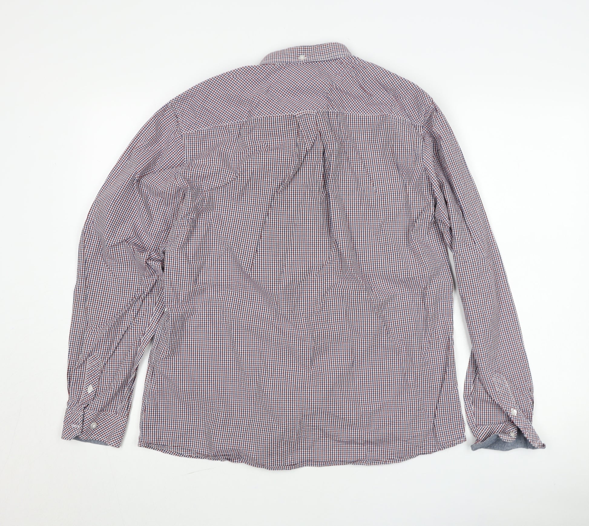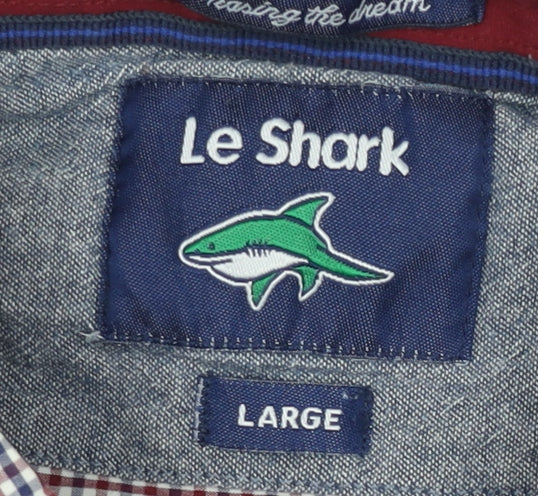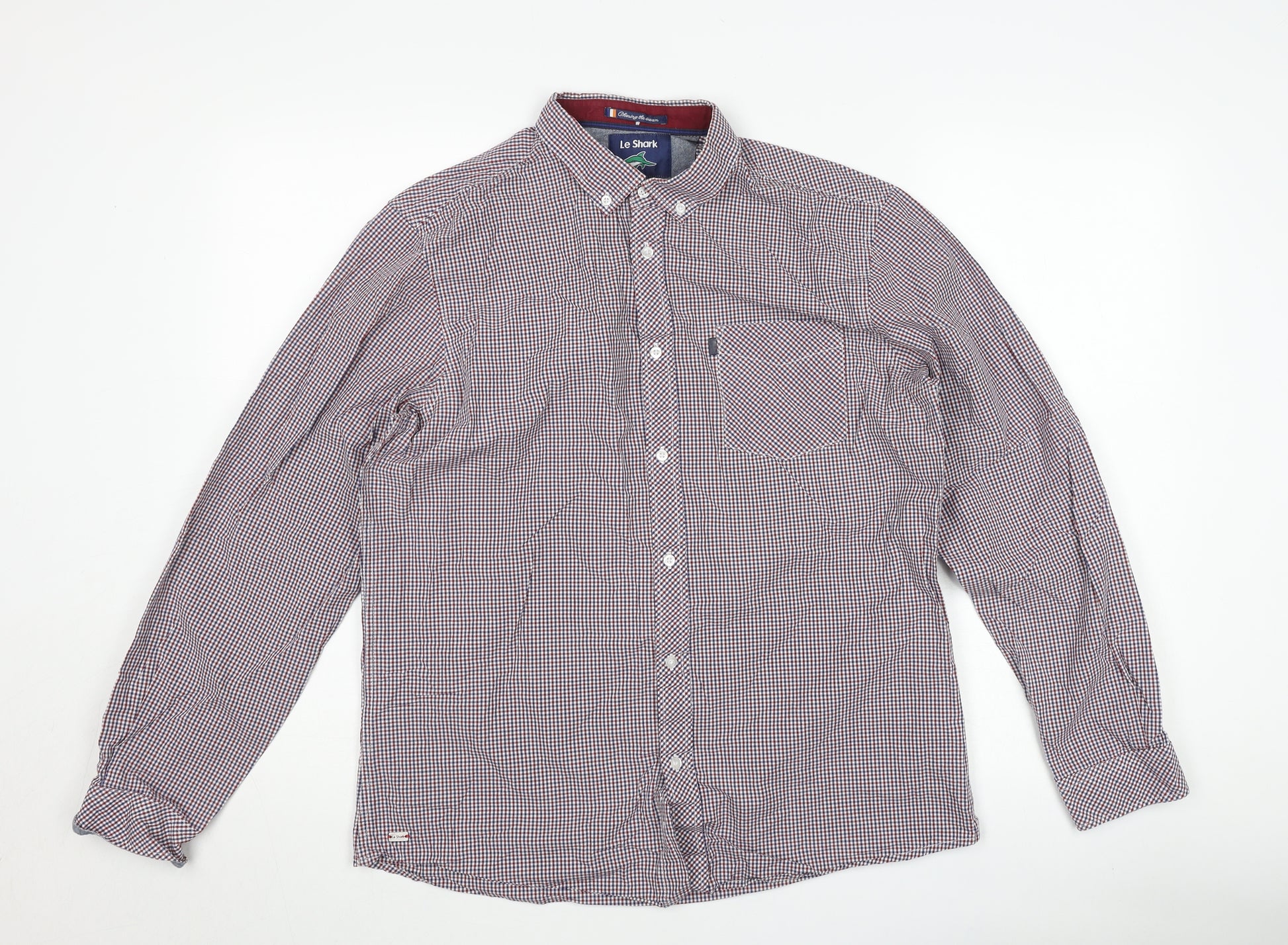 Step out in timeless style with this Le Shark men’s formal checked shirt, designed in a versatile blend of burgundy, navy and white tones. This multicoloured button-down shirt brings a refined yet casual edge, making it a wardrobe must-have for a wide range of occasions, from smart-casual office wear to relaxed evenings out. Cut in a regular fit, this large-sized shirt offers both comfort and a tailored look, striking the perfect balance for everyday versatility.Crafted from 100% cotton, the material ensures breathability and long-lasting wear, making it an excellent choice for all-day comfort. The woven fabric enhances durability while maintaining a soft and comfortable feel against the skin. Finished with a traditional collared neckline and a button-down front, this shirt features a neat chest pocket embellished with a subtle stitched logo accent, adding a touch of understated branding to its smart appeal. Classic barrel cuffs complete the traditional formal shirt styling.The shirt showcases a timeless check pattern, ideal for pairing with both denim jeans for a casual look or tailored trousers for a more refined ensemble. Its long sleeves make it perfect for year-round wear, and the breathable cotton construction ensures comfort in varying conditions. Designed with practicality in mind, the shirt is machine washable for easy care and fuss-free maintenance.Offered in very good condition, this pre-owned piece shows only minimal wear and some light creasing, demonstrating careful previous use while retaining plenty of style and longevity for its next owner. Versatile, practical and stylish, this Le Shark checked dress shirt makes a smart addition to any wardrobe, complementing both casual and semi-formal outfits with ease.If you’re looking for a casual yet polished shirt that delivers comfort, quality and timeless appeal, this Le Shark 100% cotton large-size checked shirt is the perfect choice.