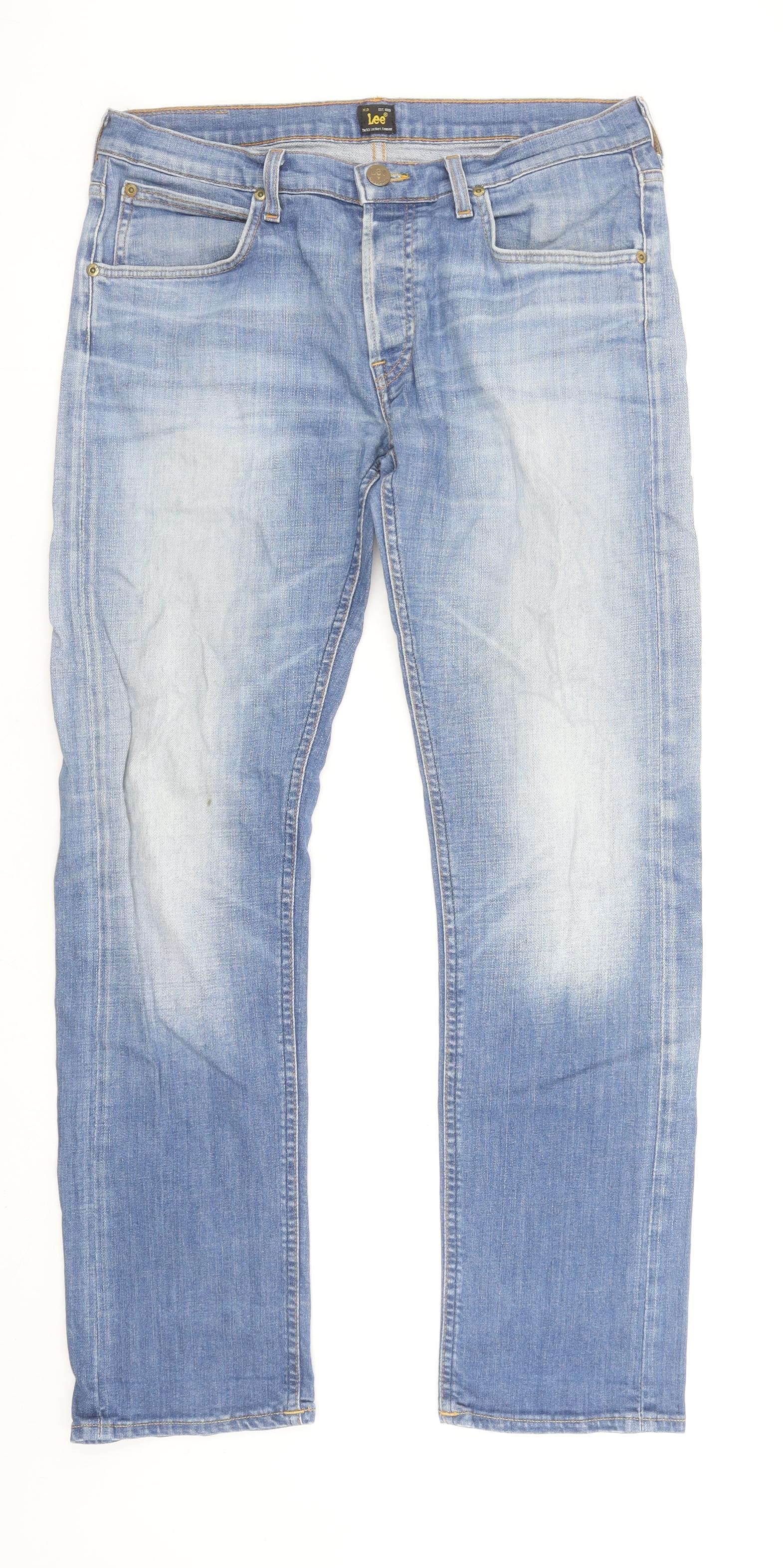 These Lee Men's Blue Daren Regular Fit Straight Leg Jeans offer a timeless, easy-to-wear style that’s perfect for all seasons. Cut in a classic straight leg shape, these jeans come in a light blue wash that gives a relaxed yet refined look for everyday outfits. Crafted from high-quality denim made from 98% cotton and 2% elastane, they offer both durability and a touch of stretch for added comfort and ease of movement. Designed for a dependable fit, these jeans feature a mid-rise waist and a traditional five-pocket design that combines practicality with classic styling. The button and zip fastening ensure a secure fit, while the subtle faded detailing on the thighs and knees adds a naturally worn-in aesthetic. The iconic Lee branding on the waistband and back pocket finishes the look with understated authenticity. Made in Turkey, these jeans are machine washable and easy to maintain, perfect for regular wear. Though previously worn, they remain in very good condition, with only a small faint mark on the front leg that doesn’t affect their overall appearance or quality. Ideal for casual days or pairing with shirts, T-shirts, or knitwear, they bring effortless everyday style to any wardrobe. Whether worn with trainers for a laid-back feel or smartened with boots for an evening out, these Lee Daren jeans will quickly become a go-to favourite. A high-quality denim staple from a trusted brand, they combine comfort, durability, and timeless appeal for the modern man seeking versatile casualwear that never dates.