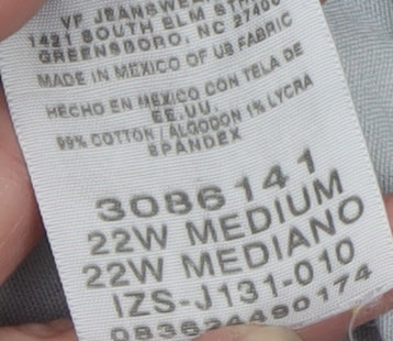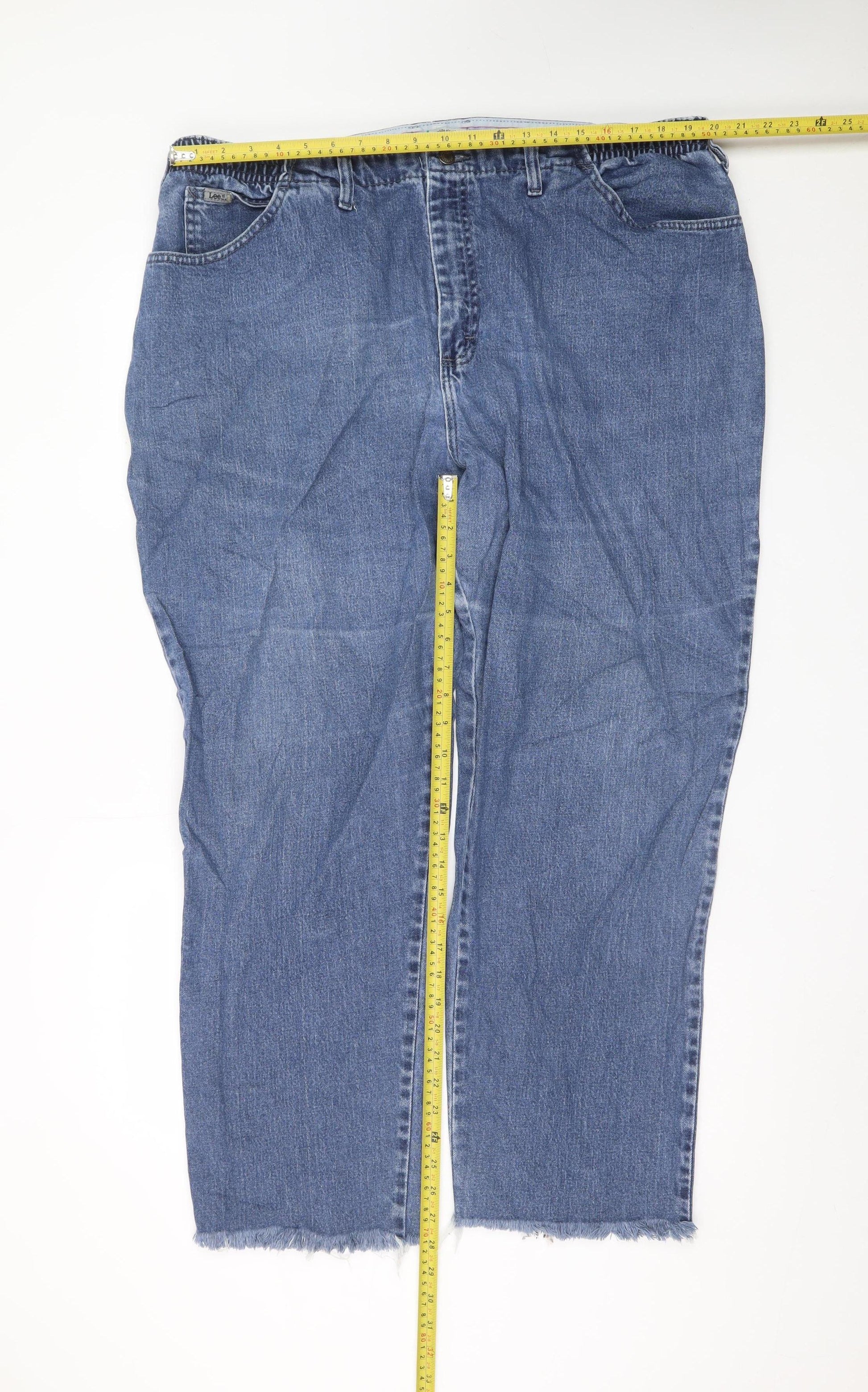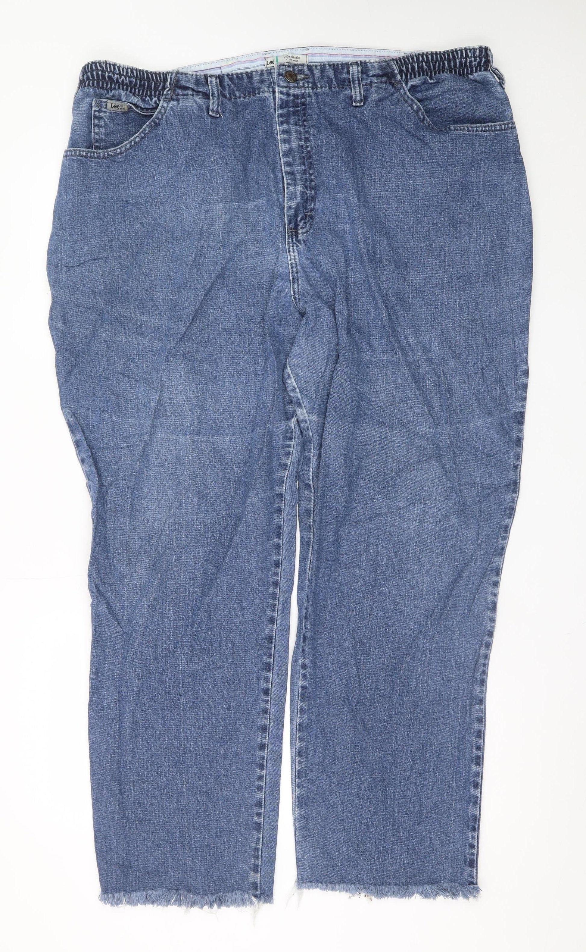These Lee women’s blue jeans combine everyday comfort with timeless casual style, designed specifically for a plus-size fit. Crafted from a soft blend of 99% cotton and 1% elastane, the denim provides a comfortable stretch while maintaining durability. The mid-rise cut offers a flattering fit that sits comfortably on the waist, enhanced by elastic inserts at the back for added flexibility and ease of movement. The jeans feature a straight leg style, giving them a classic silhouette suitable for all seasons. These jeans include a traditional five-pocket design with both front and back pockets, adding practicality and a classic denim look. The zip and button closure ensure a secure fit, while the fabric wash in medium blue adds a versatile tone that pairs effortlessly with tops and jackets for everyday wear. The slightly frayed hem adds a touch of casual charm, giving the jeans a laid-back, relaxed appearance that works perfectly for weekend outfits or off-duty days.Lee’s dedication to quality is evident in the sturdy stitching and soft, breathable denim, ideal for a range of activities from casual outings to relaxed at-home comfort. The jeans are machine washable and easy to care for, designed to retain their shape and colour with regular wear. Suitable for autumn, spring, and winter styling, they can be worn with boots, trainers, or casual shoes for a versatile wardrobe staple.In very good pre-owned condition with light wear and frayed hems for a vintage feel, these jeans are perfect for anyone seeking comfort without compromising on style. Made in Mexico from US fabric, they carry Lee’s trusted reputation for superior craftsmanship and everyday comfort. A great addition to any wardrobe for those who appreciate quality denim that fits beautifully and lasts for years to come.