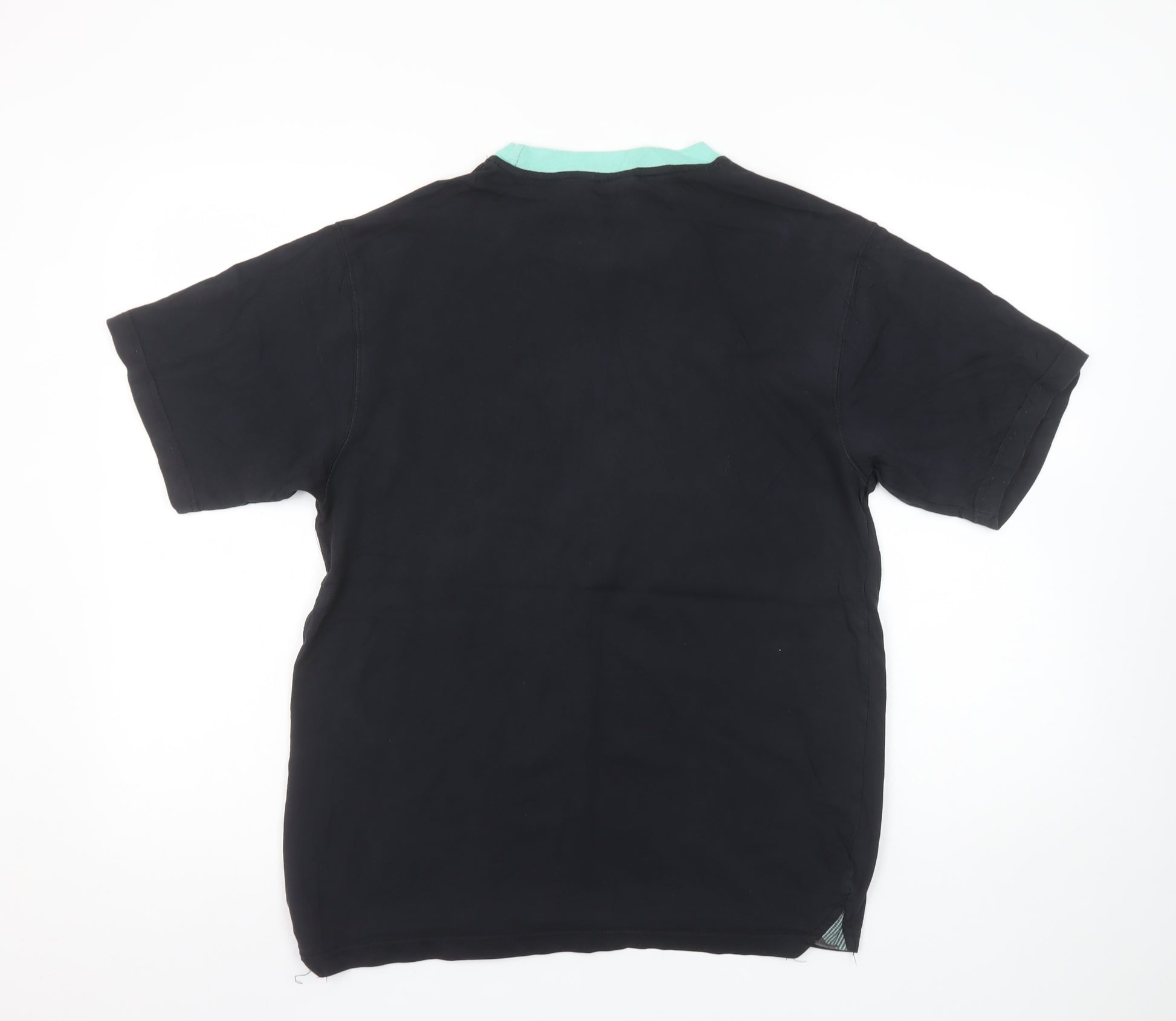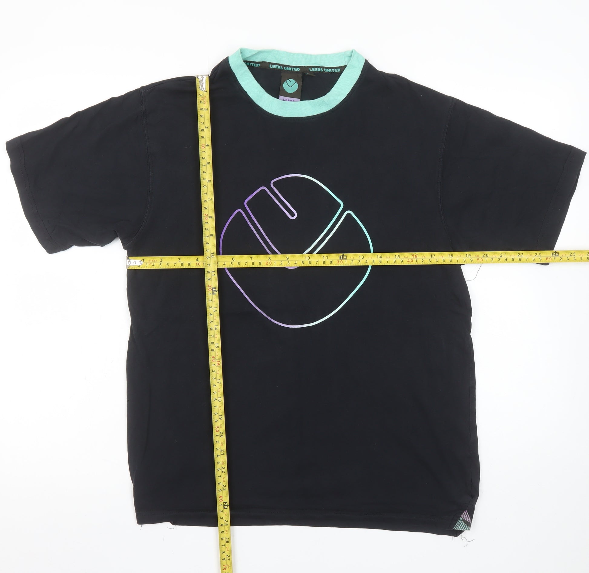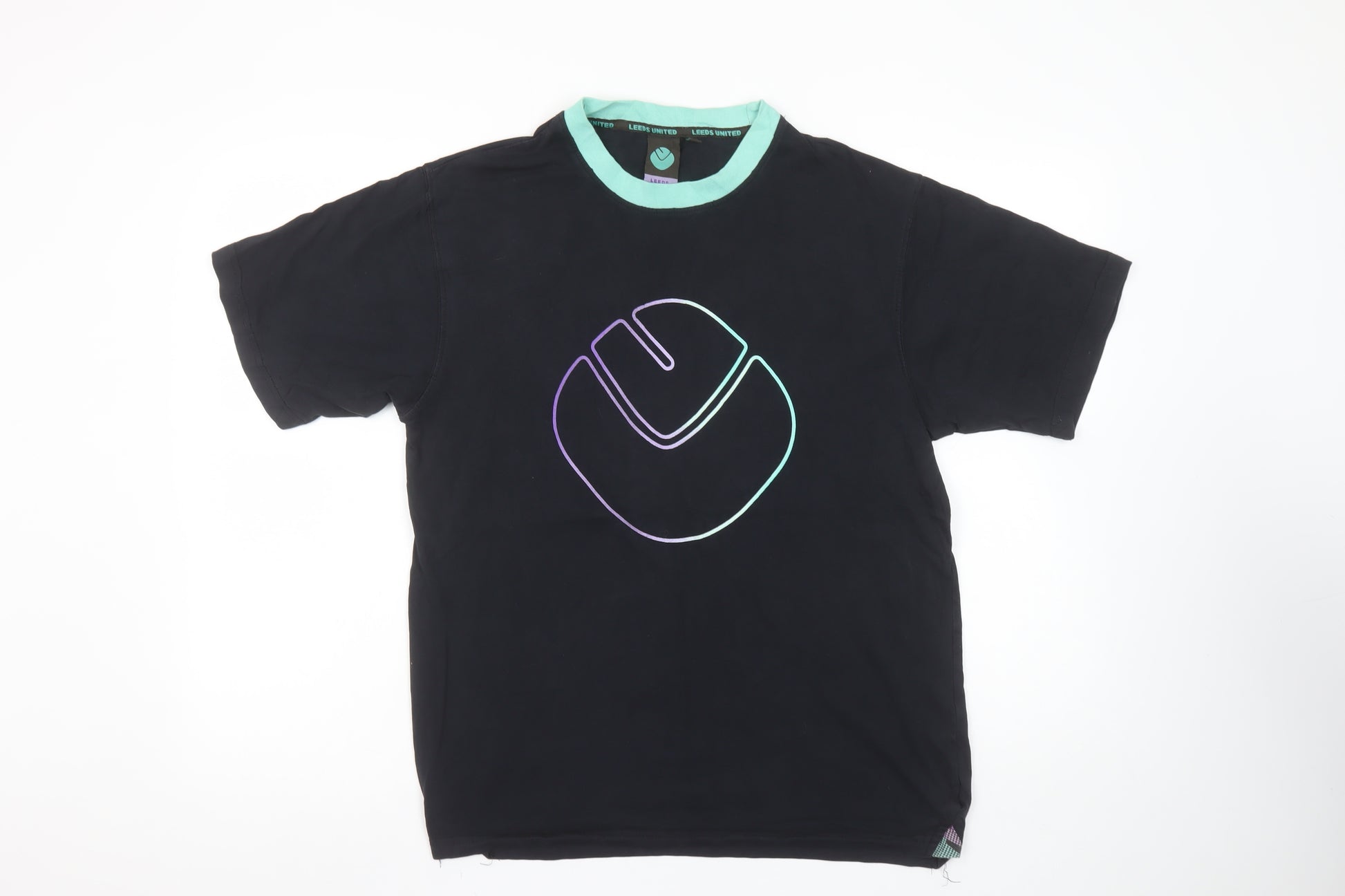 Show your support for your favourite club with this classic Leeds United men's black T-shirt. Crafted from soft 100% cotton jersey fabric, this short sleeve top provides a comfortable and breathable wear – ideal for everyday use or casual match days. The shirt features a bold Leeds United crest emblazoned across the chest in subtle gradient tones of purple and green, giving it a modern, sporty look. Finished with a contrasting mint crew neckline and subtle stitched details, this tee combines style and comfort effortlessly. With a regular fit and lightweight construction, it’s suitable for all seasons and easy to pair with jeans, joggers, or shorts. The jersey fabric ensures softness and durability, while the simple design makes it a versatile wardrobe essential for any fan of the club. This Leeds United cotton T-shirt has been well cared for and remains in excellent condition with only minimal signs of light wear and no visible marks or tears. Perfect for wearing to the stadium, casual days out, or simply lounging in relaxed comfort. Machine washable for easy care, this is a comfortable and stylish tee that showcases your team pride while keeping you cool and comfortable. A great everyday option for Leeds United supporters or collectors of official team apparel. Don’t miss the opportunity to own this comfortable and stylish Leeds United T-shirt at a great price.
