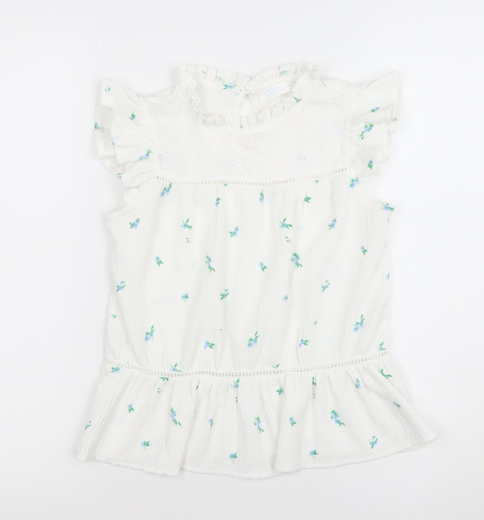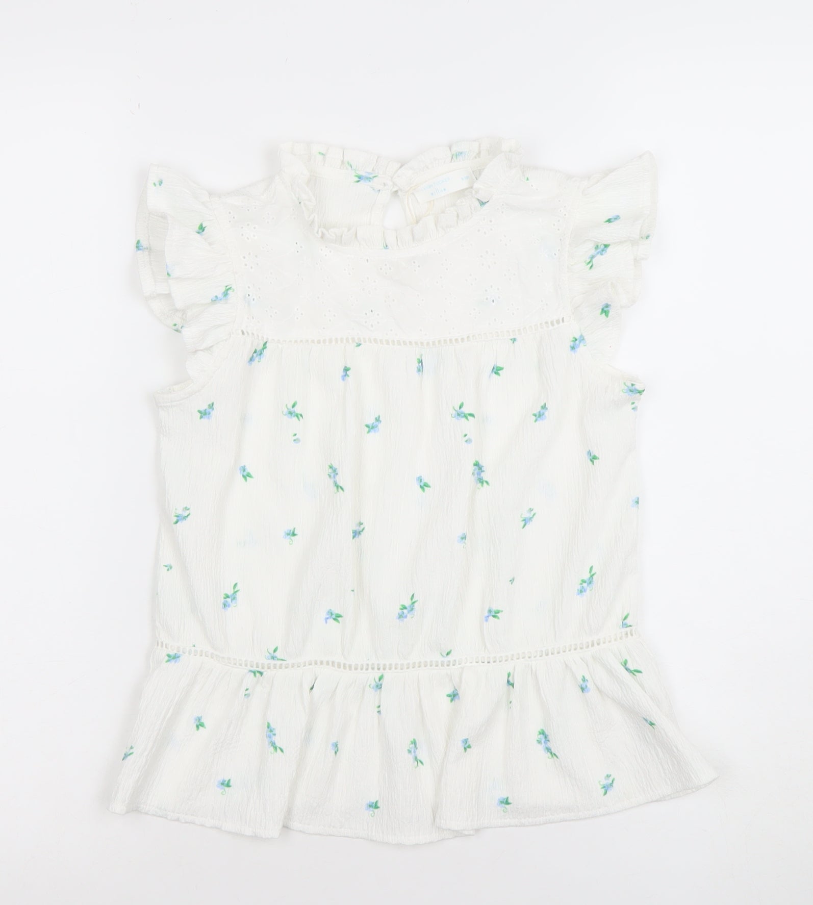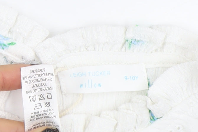 Delight your little one’s wardrobe with this charming Leigh Tucker Willow girls’ blouse in pure white, beautifully adorned with delicate blue and green floral motifs. Perfect for spring and summer, this lightweight top is crafted from a soft crepe fabric blend that includes polyester, elastane for stretch, and a cotton lace panel adding a gentle, feminine touch. The fabric offers a subtly textured look with a breathable, comfortable finish ideal for warm weather days. Designed with pretty ruffled cap sleeves and a round neckline with eyelet embroidery detailing, this blouse combines comfort with timeless style. The button keyhole closure at the back ensures easy dressing, while the relaxed fit allows for free movement, perfect for playdates, picnics, or family outings. Its floral design brings a touch of countryside charm that can easily be paired with jeans, shorts, or skirts for both casual and special occasions. Whether worn on its own in summer or layered under a cardigan in cooler months, this top is wonderfully versatile. Despite its gently pre-loved condition, it remains in excellent shape with no visible signs of wear, damage, or marks. The garment retains its colour and texture throughout, clearly cared for by its previous owner. Machine washable for easy maintenance, it’s a practical yet sweet addition to any girl’s wardrobe. Ideal for those who love classic, pretty pieces with a touch of playful elegance, this blouse captures the quality and charm synonymous with Leigh Tucker Willow designs. Add this lovely floral top to her collection for a timeless look that never goes out of style.