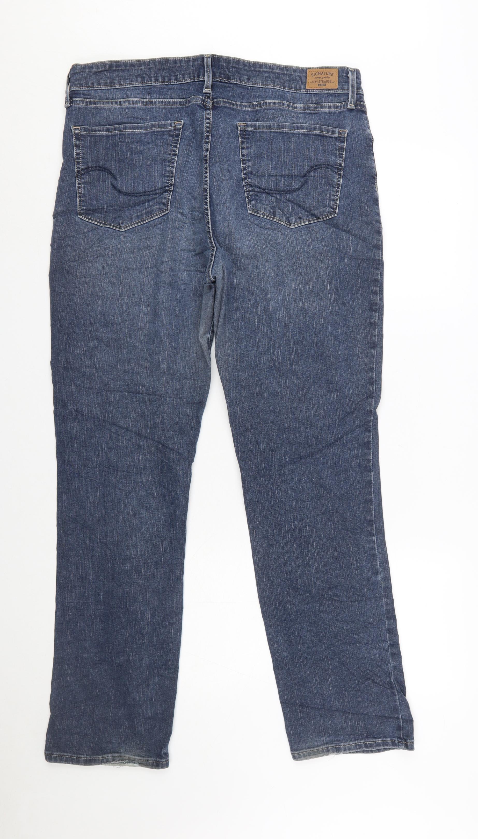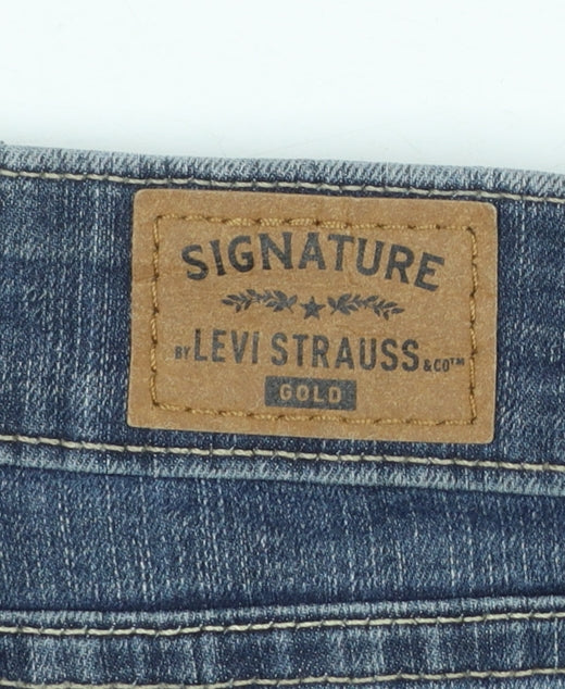 Step into timeless comfort and classic style with these Signature by Levi Strauss & Co. women’s mid-rise straight leg jeans in a flattering blue wash. Crafted from a premium cotton and elastane blend, these jeans offer a comfortable stretch fit designed to enhance shape while allowing flexibility for everyday wear. The authentic five-pocket design gives a nod to traditional denim craftsmanship, while durable stitching ensures these jeans remain wardrobe essentials for seasons to come. Featuring a medium fabric wash for a versatile denim tone, these jeans sit comfortably at the mid-rise waist, offering a secure but flexible fit that flatters a variety of body types. The 33-inch waist and 32-inch inside leg deliver a classic silhouette suitable for both casual and smart-casual styling. Pair them effortlessly with jumpers, blouses, or jackets for a look that transitions easily from day to evening. The subtle stretch fabric ensures day-long comfort, while functional front and back pockets provide both style and practicality. Finished with Levi Strauss' iconic Signature label detail, these jeans represent quality and enduring appeal. Ideal for wearing throughout autumn, winter, and into spring, they’re durable and easy to care for—simply machine washable for easy maintenance. These jeans remain in good pre-loved condition with minimal signs of wear, including slight fraying at one hem, which adds a hint of character without affecting overall appearance or comfort. Whether you’re dressing for the weekend, casual Fridays, or relaxed evenings out, these mid-rise straight jeans from Levi Strauss & Co. are an easy choice for effortless, timeless denim confidence.