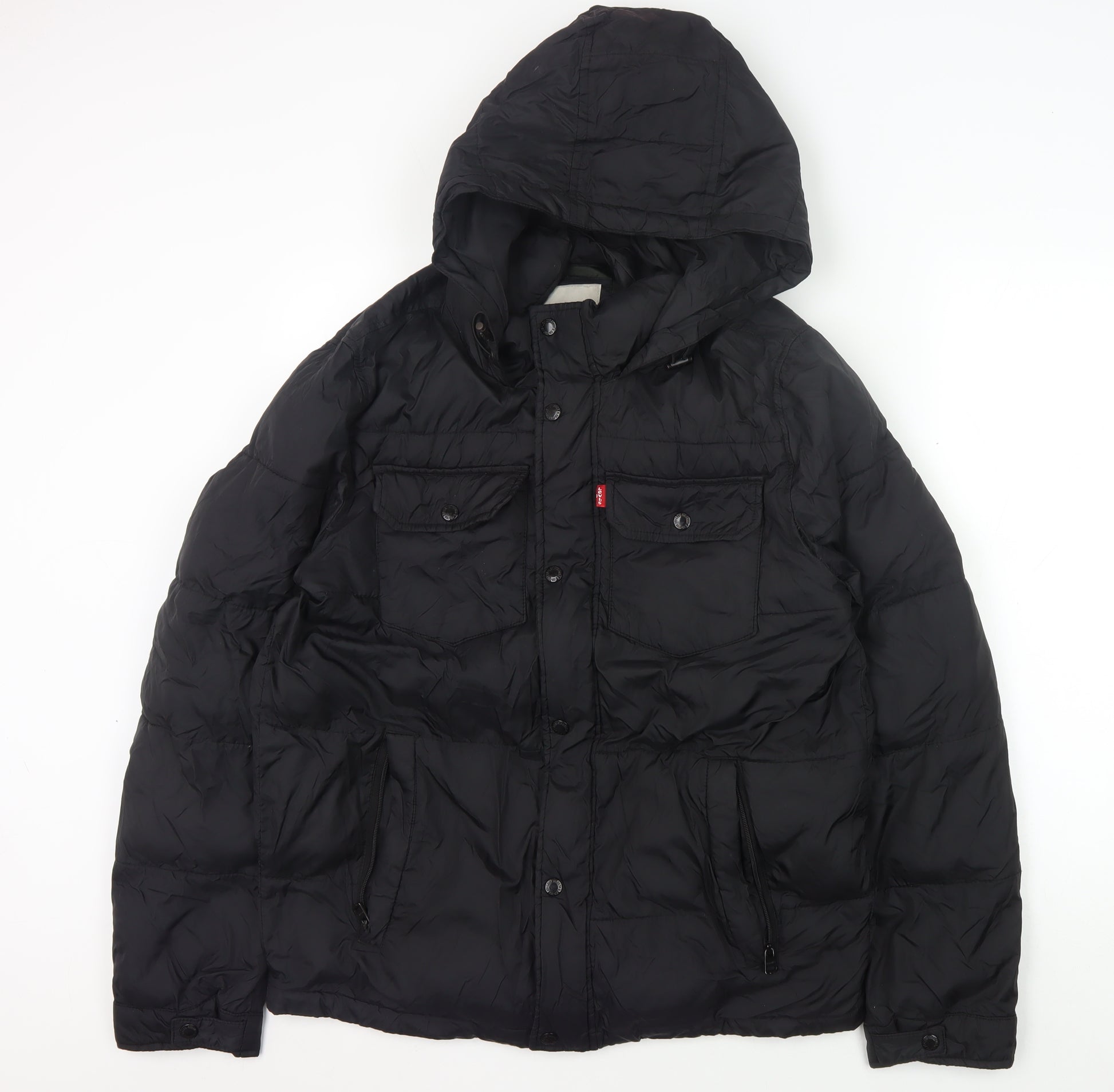 Stay warm and stylish with this Levi's Men's Black Puffer Jacket, sized Small. With its sleek black colour and regular fit, this jacket is ideal for casual outings during the chilly autumn and winter seasons. Made from 100% polyester, it boasts a hooded design for added warmth and protection against the elements. The lined interior ensures extra comfort, while the iconic Levi's logo accentuates its timeless appeal. Perfect for layering over your everyday wear, this mid-length jacket fastens securely with a zip closure, making it a functional yet fashionable piece for any wardrobe. Machine washable for easy care, this jacket is excellent for those seeking both quality and durability. Its no-pattern design allows for versatile styling, suiting various occasions from casual outings to leisurely walks. Elevate your outerwear collection with this must-have puffer jacket from Levi's.