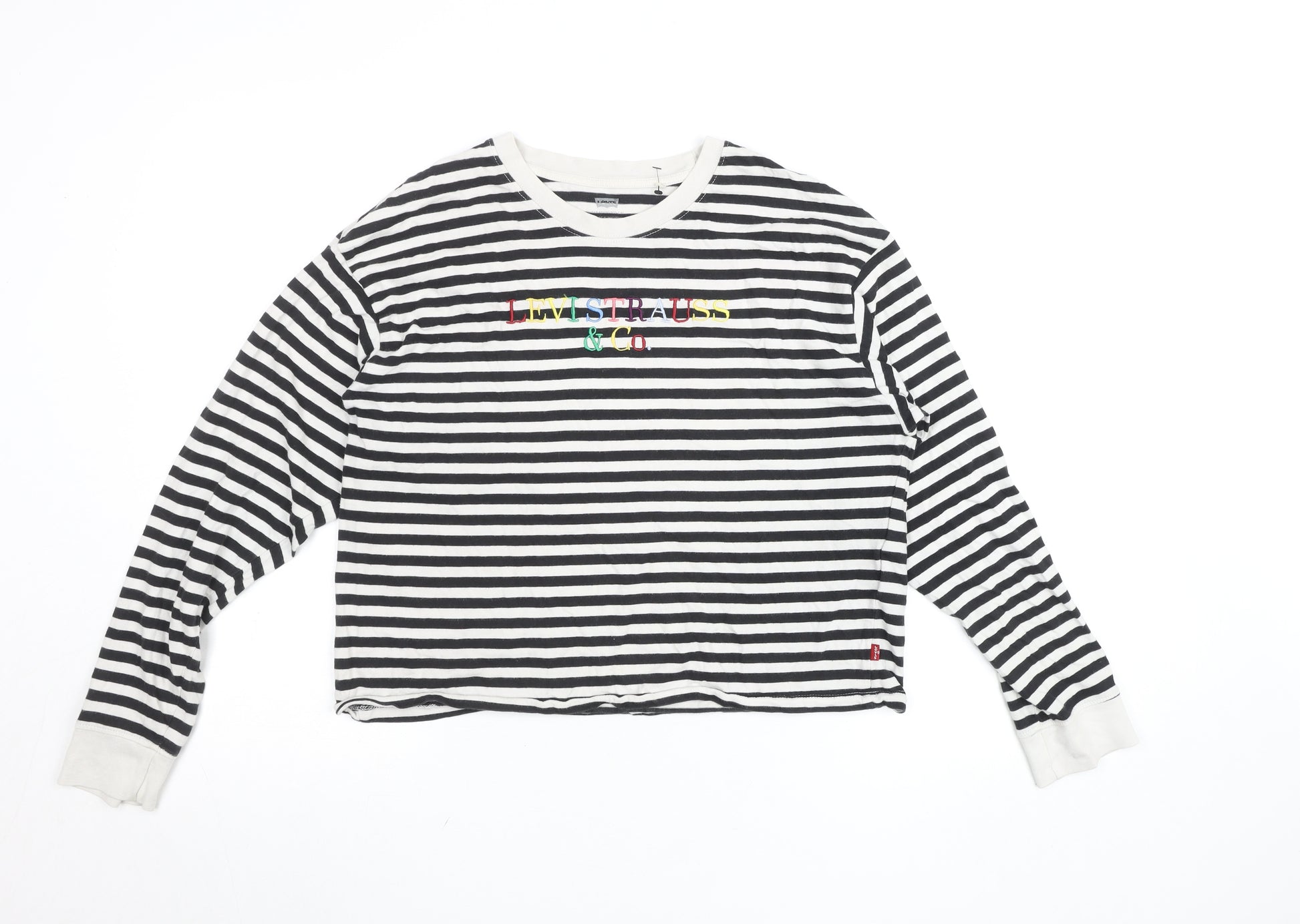 Step out in effortless style with this Levi's Women's Black & White Striped Cropped Long Sleeve T-Shirt in size Small. Crafted from 100% soft jersey cotton, this piece combines breathability and durability for a truly comfortable everyday wear. The striking black and white horizontal stripe design offers a chic, timeless look with an easy, relaxed fit. Featuring the classic 'Levi Strauss & Co.' embroidered logo in colourful thread on the chest, it adds a bold pop of style to your casual wardrobe. Cut in a slightly cropped style, it flatters your figure while keeping things fun and trendy, perfect for pairing with high-waisted jeans, skirts, or shorts. The crew neckline and fitted long sleeves provide a balanced silhouette ideal for layering under jackets or cardigans through multiple seasons. Designed for versatility, this top works well in spring, autumn, or even cooler summer days. The 100% cotton jersey fabric ensures softness and easy care, remaining breathable throughout daily wear. With Levi’s famous craftsmanship and a heritage that celebrates individuality and comfort, this piece brings a blend of modern casual and vintage charm. While gently worn, it remains in excellent pre-owned condition, showing minimal signs of use and no visible flaws. Machine washable for effortless care, it’s a wardrobe essential that brings both comfort and personality to your everyday looks. Whether you’re heading out for a coffee, working from home, or completing your favourite casual outfit, this Levi's cropped striped tee delivers effortless confidence and authentic retro-inspired style that never goes out of fashion.