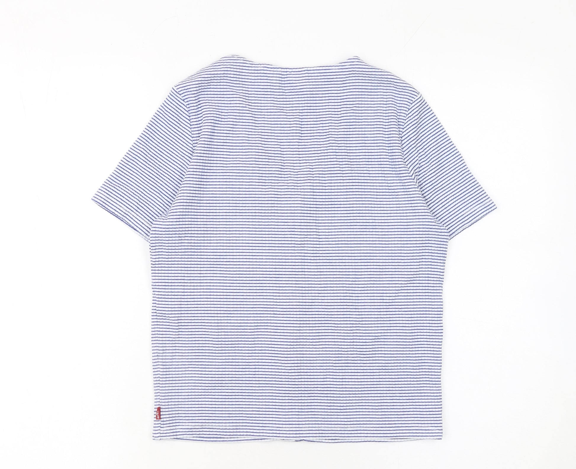 Add a touch of classic charm to your wardrobe with this Levi's Women's Blue Striped Short Sleeve Button-Up Top in size M. Expertly crafted from a comfortable jersey fabric blend of 97% cotton and 3% elastane, this piece offers a soft, breathable feel with a slight stretch for added comfort. The timeless striped pattern in blue and white provides effortless style that works perfectly for both everyday wear and relaxed weekend looks.The V-neckline and short sleeves create a flattering, relaxed silhouette that pairs beautifully with jeans, skirts, or shorts. The button-up front adds a versatile, casual touch that makes this top easy to dress up or down depending on the occasion. Designed for comfort and simplicity, its lightweight fabric ensures a cool and easy fit for warmer weather, ideal for spring and summer days.Levi's attention to quality detail means you’re investing in a top that balances durability with effortless style. The soft stretch fabric ensures a flattering shape that moves with you, making it suitable for casual outings, travel, or a laid-back workday look. The subtle Levi's branding at the hem adds a hint of signature authenticity without overpowering the minimalist aesthetic.This top is in excellent condition with minimal signs of wear, ensuring plenty of life left for its next owner. Machine washable for easy care, it’s the perfect go-to staple for a modern, casual look that fits seamlessly into your wardrobe.Whether styled with denim and trainers for a classic Levi’s ensemble or layered under a light jacket for transitional seasons, this striped top will soon become one of your wardrobe favourites. Offering quality, comfort, and timeless appeal, this Levi’s Button-Up Top delivers everyday versatility and effortless charm. Perfect for a woman who values casual elegance and lasting quality in her wardrobe basics.