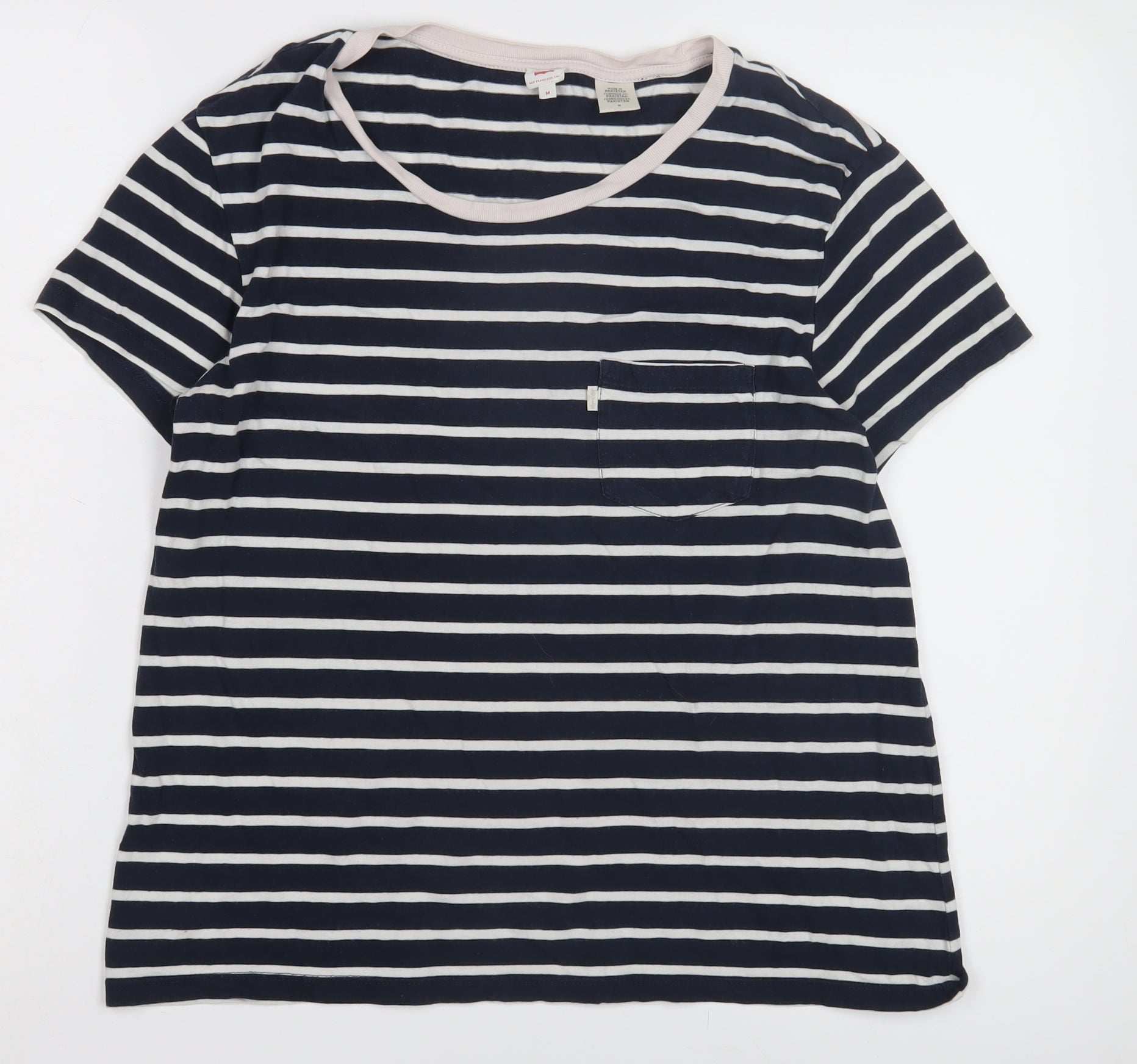 This Levi's women's T-shirt is a versatile choice for any casual wardrobe. Crafted from breathable 100% cotton jersey, it ensures comfort and style with its regular fit. The timeless blue and white striped pattern adds a classic touch, making it suitable for all seasons. Its crew neckline and short sleeves offer a basic yet chic look, perfect for everyday wear or relaxed outings. Machine washable for easy care, this T-shirt is in excellent condition, with no visible flaws. Elevate your casual ensemble with this Levi's staple, ideal for pairing with jeans or shorts to create a laid-back vibe.