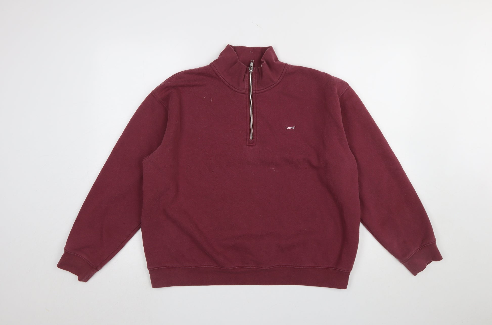 This Levi’s women’s burgundy half-zip sweatshirt combines timeless casual style with comfort and warmth, ideal for everyday wear throughout the seasons. Crafted from a soft and durable cotton-polyester fleece blend, it offers a cosy, breathable feel with the resilience to maintain shape and colour after repeated washes. The versatile maroon shade provides a rich, flattering tone that pairs effortlessly with jeans, leggings, or skirts for a laid-back yet refined look. Designed with a high neckline featuring a metal half-zip closure, it allows adjustable ventilation for layering and comfort. The ribbed cuffs and hem ensure a snug fit that retains its form, while the classic Levi’s logo subtly embroidered on the chest adds a touch of iconic branding. This long-sleeve pullover style provides reliable warmth for cooler days without feeling bulky, making it a wardrobe staple for casual outings, travel, or cosy weekends at home. The minimalist finish and regular fit make it a versatile piece suited to all body shapes. Ideal for autumn and winter, yet lightweight enough for spring layering, this sweatshirt blends practicality with relaxed style. In excellent pre-owned condition, showing light wear and no flaws, it delivers quality and comfort synonymous with Levi’s craftsmanship. A must-have casual essential with enduring appeal for anyone who appreciates simple, stylish comfort from a trusted brand.