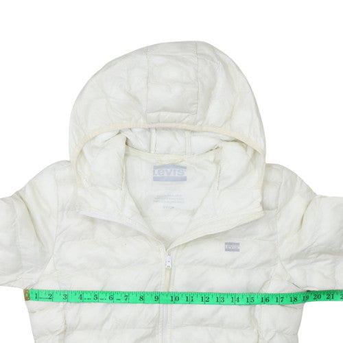 Stay stylish and snug in this Levi’s women’s white puffer jacket — a versatile essential that combines comfort and practicality for cooler seasons. Crafted from 100% polyester, this lightweight jacket provides excellent insulation without adding bulk, making it perfect for layering across autumn and winter. The quilted design offers a classic and timeless look, while the hood adds an extra touch of warmth and protection from the elements. Designed with functionality in mind, it features a full zip front closure, two pockets for convenience, and a lined interior that ensures comfort throughout the day. The Levi’s embroidered logo accent on the chest is a subtle nod to iconic denim craftsmanship and trusted quality. Ideal for casual outings, travel, or everyday wear, this jacket can easily pair with jeans, leggings or dresses for a relaxed yet put-together look. The crisp white colour gives a clean, modern feel and complements a wide range of outfits. Made for women who love practical fashion, the regular fit ensures comfort and flexibility, while the microfibre texture offers a soft and durable finish. Whether you’re heading out for a brisk walk, commuting, or simply enjoying an off-duty day, this Levi’s hooded puffer jacket is a wardrobe staple you’ll turn to again and again. In excellent pre-owned condition with minimal signs of wear, this piece has been carefully checked to ensure quality and long-lasting performance. Elevate your outerwear collection with a brand synonymous with timeless American style. Practical, flattering, and effortlessly chic — it’s the perfect finishing touch to your everyday look.