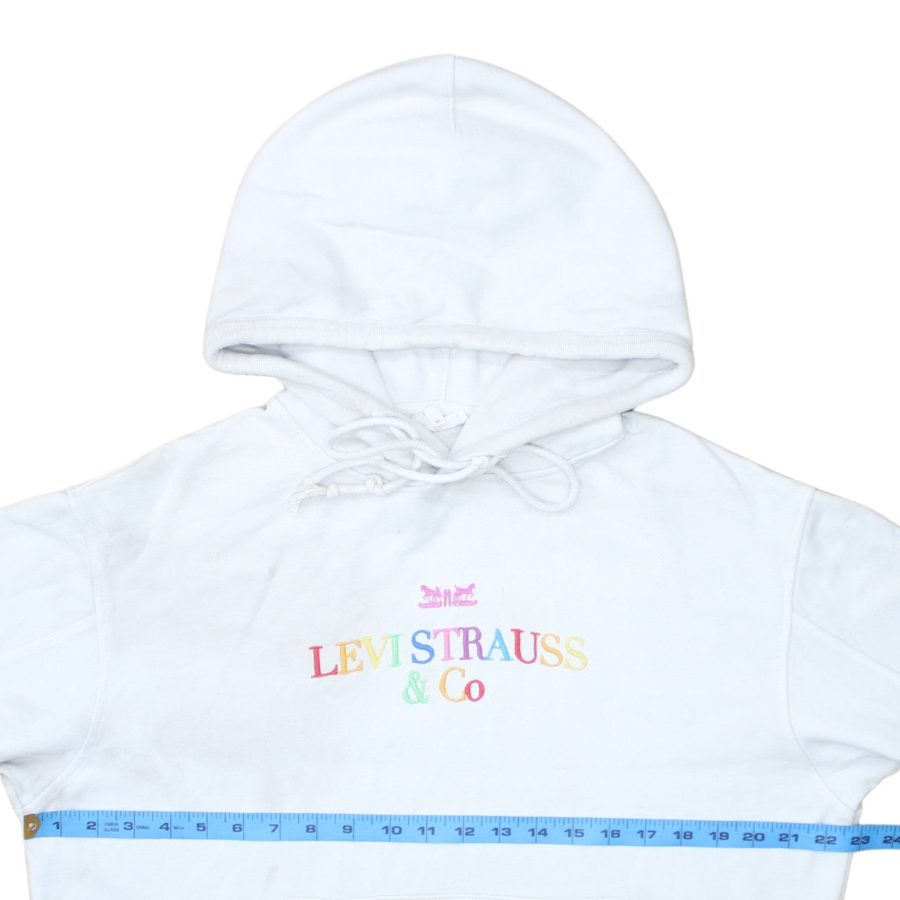 Stay effortlessly comfortable with this Levi's Women's White Hooded Sweatshirt. Crafted from a soft fleece blend of 90% cotton and 10% polyester, this pullover hoodie provides lasting comfort and breathability. Featuring Levi's signature rainbow 'Levi Strauss & Co' logo across the chest, it channels bright, casual style perfect for everyday wear. The adjustable drawstring hood and classic kangaroo pocket offer added warmth and practicality, making it ideal for layering through Autumn, Winter, and Spring seasons. Designed in a regular fit and finished with long raglan sleeves and ribbed hems, it delivers a flattering, comfortable silhouette. Perfect for relaxed outings, running errands, or cosy days indoors. The pure white colour brightens your casual outfits and pairs perfectly with jeans, joggers, or leggings. This Levi's hoodie blends premium quality with iconic branding for a timeless, laid-back look. In very good used condition with a small light mark on the front pocket, this piece remains stylish and ready for many more wears. Maintain easily with simple machine washing. A must-have for Levi's fans seeking classic comfort with a colourful twist.