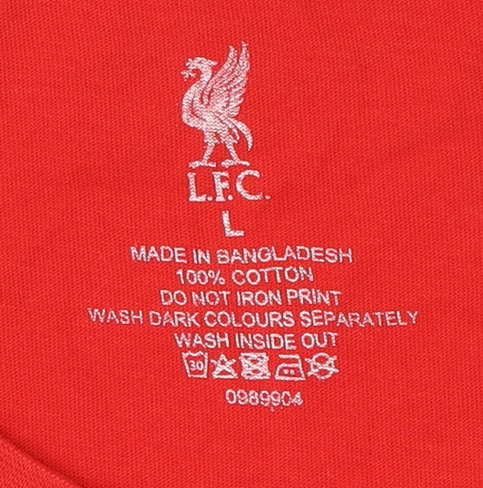 Celebrate the glorious victory of Liverpool FC with this vibrant red t-shirt, a must-have for any dedicated fan. Made from 100% soft cotton, this t-shirt promises comfort and breathability, making it suitable for all seasons. The front proudly displays a graphic print celebrating Liverpool FC's Premier League Championship, allowing you to wear your team spirit with pride. Designed for men, this size large t-shirt features a classic crew neck and short sleeves, offering a relaxed fit perfect for everyday wear. The fabric's soft jersey knit enhances the comfort and style, while the iconic LFC logo accentuates its sports theme. Machine washable and easy to care for, this shirt is not only stylish but also practical for your regular wardrobe rotation. Although gently worn, it showcases light wear with no tags, ensuring excellent condition throughout. Whether you're heading to the stadium or simply lounging at home, this LFC Men’s Large Red Crew Neck Graphic T-Shirt is an ideal choice to display your unwavering support. Grab a piece of football history for your collection today.
