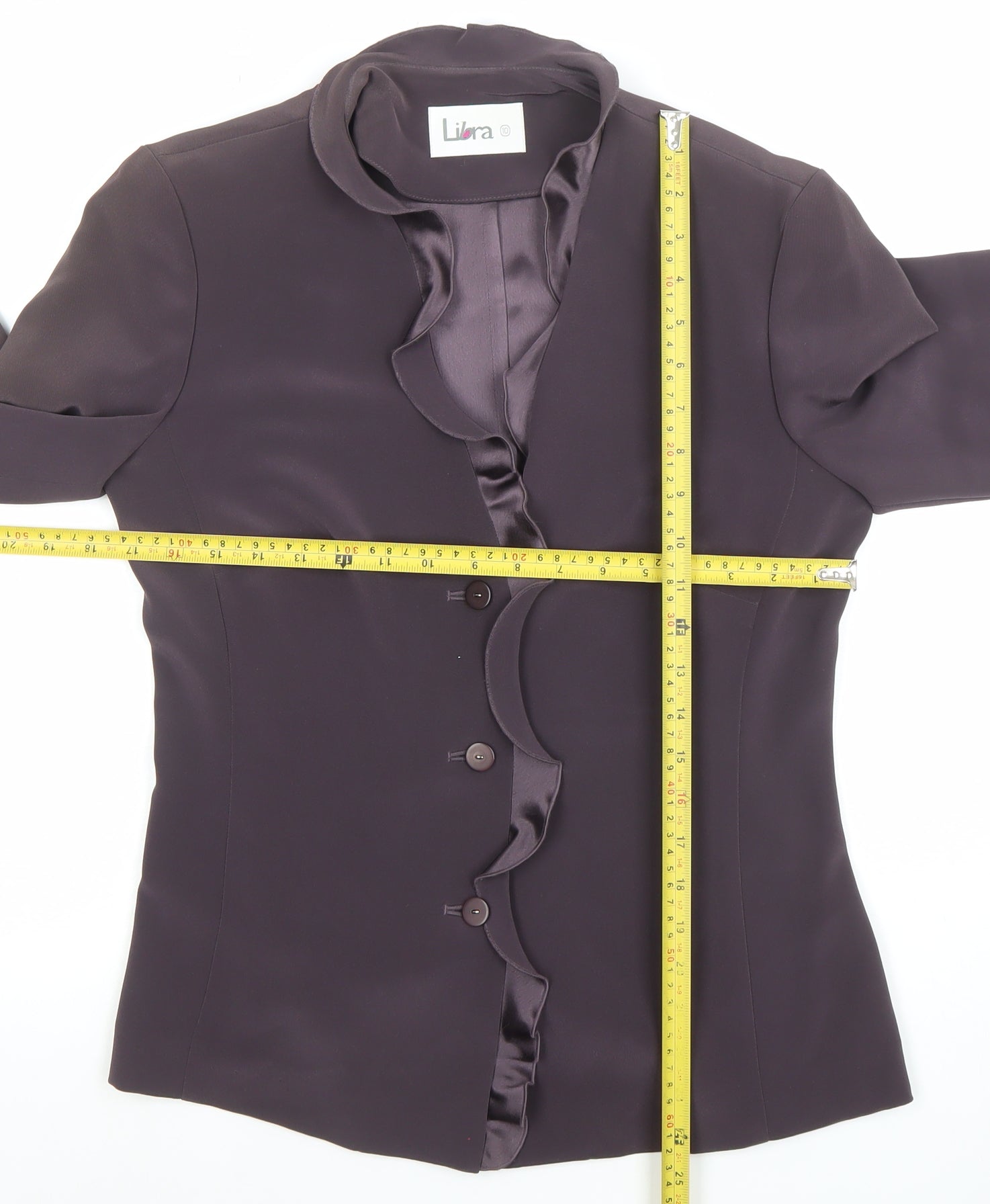 This elegant Libra women's suit jacket in a deep brown hue offers a sophisticated tailored style perfect for business, formal, or workwear occasions. Crafted from a high-quality woven fabric blend of 80% triacetate and 20% polyester, it provides a refined, smooth drape with a durable yet comfortable feel. The design features a beautiful shawl collar with a soft ruffled edge along the front placket, adding a unique feminine touch to a traditional silhouette. The single-breasted front is finished with three coordinating buttons, and the structure is subtly shaped through the waist for a flattering fit that complements the natural curves of the body. Fully lined for comfort and durability, this jacket works beautifully paired with tailored trousers or a matching skirt for a polished appearance. Ideal for professional settings, formal events, or any occasion requiring understated elegance, this Libra piece reflects timeless sophistication with modern charm. The long sleeves and regular jacket length make it versatile for year-round wear, particularly suitable for autumn and spring seasons. In excellent pre-owned condition with light signs of wear but no significant flaws, this suit jacket remains in great overall shape. Its premium triacetate and polyester fabric composition ensures lasting quality and easy maintenance, with dry clean only care recommended. A perfect choice for anyone looking to add classic refinement and versatility to their wardrobe, this Libra women’s brown suit jacket is a stylish and smart investment for both office and special event dressing alike.