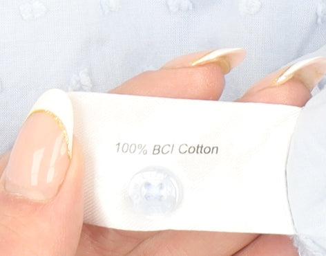 Elevate your everyday wardrobe with this lovely blue long sleeve button-up shirt from Lily Of The Row. Expertly crafted from 100% BCI cotton, this shirt offers breathable comfort and a lightweight feel, making it a perfect choice for year-round wear. The soft woven cotton fabric ensures durability while maintaining a refined, casual elegance suitable for both workwear and weekend dressing. Designed in a timeless button-up style with a classic collared neckline, it features a neat front pocket and full button fastening, offering a crisp and tailored finish. The flattering regular fit and long sleeves with button cuffs make this shirt versatile and easy to style for many occasions — pair it with jeans for relaxed days, or tuck it into tailored trousers or a skirt for a polished office look. The blue hue with subtle texture adds a touch of subtle sophistication that complements a wide range of outfits and accessories. Ideal for spring, summer, and autumn, this shirt balances comfort, style, and practicality beautifully. Its smart yet casual aesthetic ensures it remains a wardrobe favourite for multiple seasons. This pre-loved piece is in excellent condition, showing only slight creasing that can be easily resolved with a quick press. A dependable staple that perfectly blends simplicity and style, this Lily Of The Row shirt will soon become your go-to for both casual and semi-formal occasions. Whether layered under a knit or worn on its own, it’s an effortlessly chic choice for modern women who appreciate classic design and comfort.