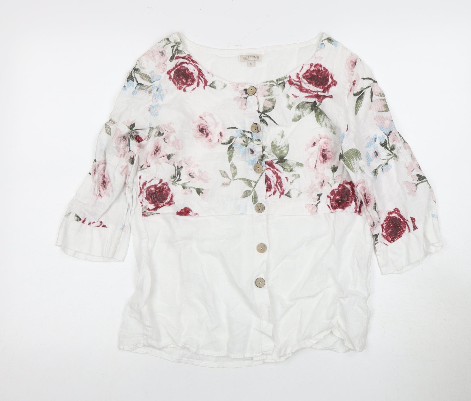 Embrace effortless style with this beautiful white floral blouse from Lina Tomel, expertly crafted in Italy. This women's blouse, in a size M, showcases a delicate 100% linen fabric that offers breathability and comfort, making it a perfect choice for a relaxed, yet elegant look. The blouse features a charming scoop neckline and 3/4 length sleeves adorned with a pretty floral pattern, adding a touch of femininity to your wardrobe. Button accents provide subtle detailing, enhancing the shirt's overall aesthetic. Ideal for casual occasions, this blouse pairs beautifully with both jeans and skirts. The fabric's light texture ensures it drapes gracefully, while the regular fit promises a flattering silhouette. This piece remains in excellent condition, showing no signs of wear, making it a stylish and versatile addition to any collection.