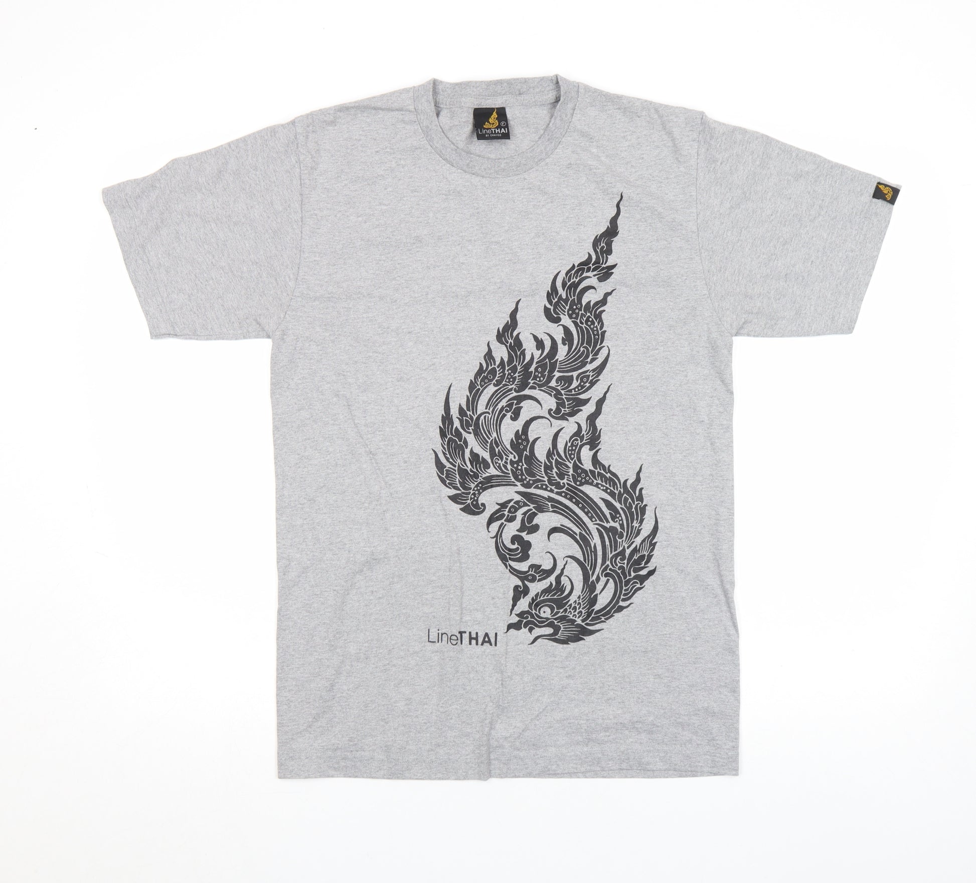This LineTHAI by Chaiyos men's short sleeve T-shirt offers a unique blend of cultural artistry and modern comfort. Made in Thailand from 100% breathable cotton, this top provides a soft and lightweight feel that’s perfect for everyday wear. The front features a striking black ornate flame-style Thai art print set against a clean grey backdrop, ideal for those who appreciate detailed and symbolic designs. With a classic crew neck and regular fit, it ensures ease of movement and a timeless silhouette that flatters a variety of body types. The T-shirt is crafted from high-quality jersey cotton, ensuring durability and comfort through every wash and wear. The breathable material helps to keep you cool and fresh during warmer seasons, making it a perfect choice for spring and summer outfits. Whether paired with jeans, shorts, or joggers, this versatile piece transitions seamlessly between casual outings, cultural festivals, or relaxed weekends. The subtle LineTHAI branding adds an authentic touch, enhancing its appeal as a cultural and artistic graphic tee. Ideal for men who enjoy understated yet expressive clothing, this T-shirt adds personality without compromising comfort. Its simple colour palette of mid-grey tones complements a wide range of wardrobe choices, making it easy to style for any casual occasion. The attention to detail, from the well-finished neckline to the precise print placement, reflects quality craftsmanship. A must-have addition for those who value unique global-inspired fashion, this LineTHAI T-shirt also makes a thoughtful gift for fans of Thai art and design. Overall, this premium artistic piece from LineTHAI offers both originality and everyday practicality. It represents a blend of cultural heritage and contemporary fashion—a standout graphic tee that combines soft cotton fabric, breathable comfort, and a distinctive aesthetic that truly makes it one of a kind.