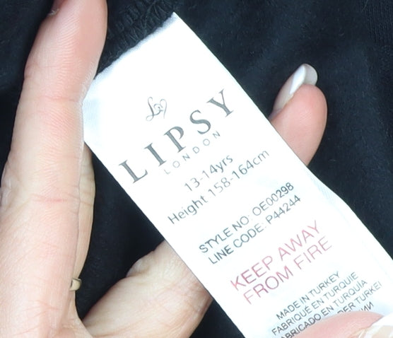 This stylish black dress from Lipsy London is a perfect blend of comfort and playful personality for girls aged 13 to 14 years. Made from a high-quality jersey fabric that combines 50% cotton and 50% polyester, this dress ensures a soft feel with a durable structure, ideal for year-round wear. Featuring a bold graphic print design with charming closed eyes and golden lips on the chest, it embodies youthful fun while maintaining a chic edge. The arm detail with the 'be unique' quote adds an empowering message, making it a distinctive staple in any wardrobe.Designed in a relaxed T-shirt dress fit, the long sleeves and crew neckline provide warmth and coverage, making it great for cooler weather in autumn or winter. Perfect for casual weekends, relaxed outings, or even laid-back parties, the pull-on design keeps dressing simple. The smooth jersey fabric allows comfortable movement, ensuring practicality while maintaining fashionable appeal. This Lipsy dress offers a flattering knee-length cut that pairs effortlessly with leggings, tights, or sneakers for an easy and stylish look.In excellent condition with no visible flaws, this piece has been gently used and carefully maintained. The absence of tags indicates it is pre-loved but of high quality. Machine washable for easy upkeep, this versatile dress promises both style and convenience. Its unique playful graphic makes it especially appealing for fashion-conscious teens who love fun statement clothing. Whether for school, social events, or casual family gatherings, it adds personality and comfort to any outfit. A fantastic value choice that combines brand quality with trendy design, perfect for everyday wear or gifting.