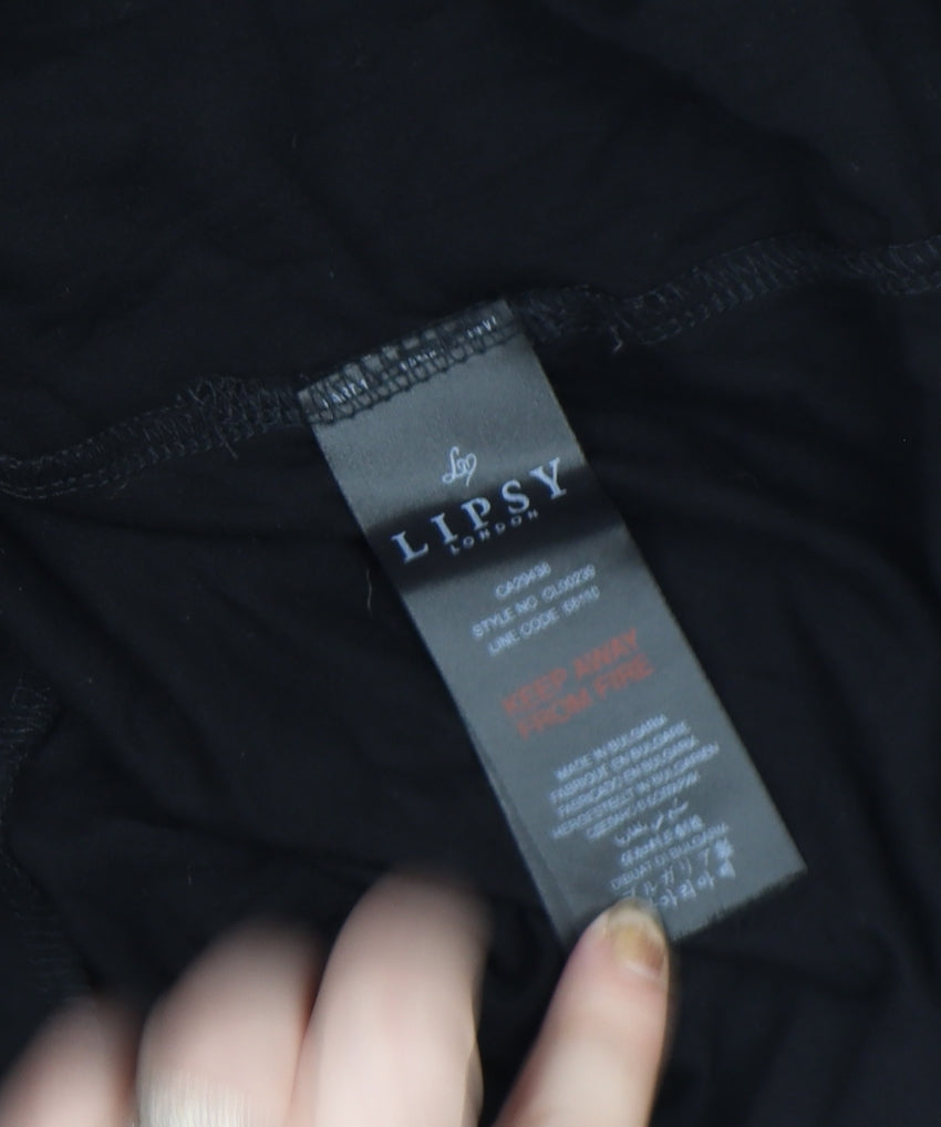 Elevate your wardrobe with this stunning Lipsy London women’s black tunic blouse. Designed to add a chic, feminine flair to your outfit, this top perfectly balances comfort and elegance. Crafted from a soft and stretchy blend of viscose and elastane, it provides a flattering drape and breathable wear ideal for daily use or special occasions. The blouse features charming three-quarter length bell sleeves adorned with intricate lace detailing, adding a graceful, romantic touch that makes it effortlessly versatile. Its round neckline and pullover design ensure simple styling and easy dressing. The regular fit flatters a range of body shapes while maintaining comfort throughout the day. Suitable for the modern woman, this Lipsy top pairs beautifully with jeans for a casual yet polished look or with tailored trousers or a skirt for an elegant evening ensemble. The solid black hue ensures timeless versatility, effortlessly complementing both classic and on-trend wardrobes. Ideal for autumn, spring, or cooler summer evenings, it can be layered under jackets or worn as a statement piece. Whether heading to a relaxed lunch, evening drinks, or a cocktail party, this stylish top adds a refined and subtly glamorous appearance. The lace cuffs deliver just the right amount of texture and contrast, creating a look that is both sophisticated and contemporary. Machine washable for easy care, this blouse exemplifies Lipsy’s dedication to fashion-forward style and practicality. Lightly worn and in very good condition, it retains its original quality and structure, ready to enhance your collection with understated luxury. A wardrobe essential for those who appreciate elegant detail and versatile fashion, this piece embodies both everyday wearability and effortless charm.