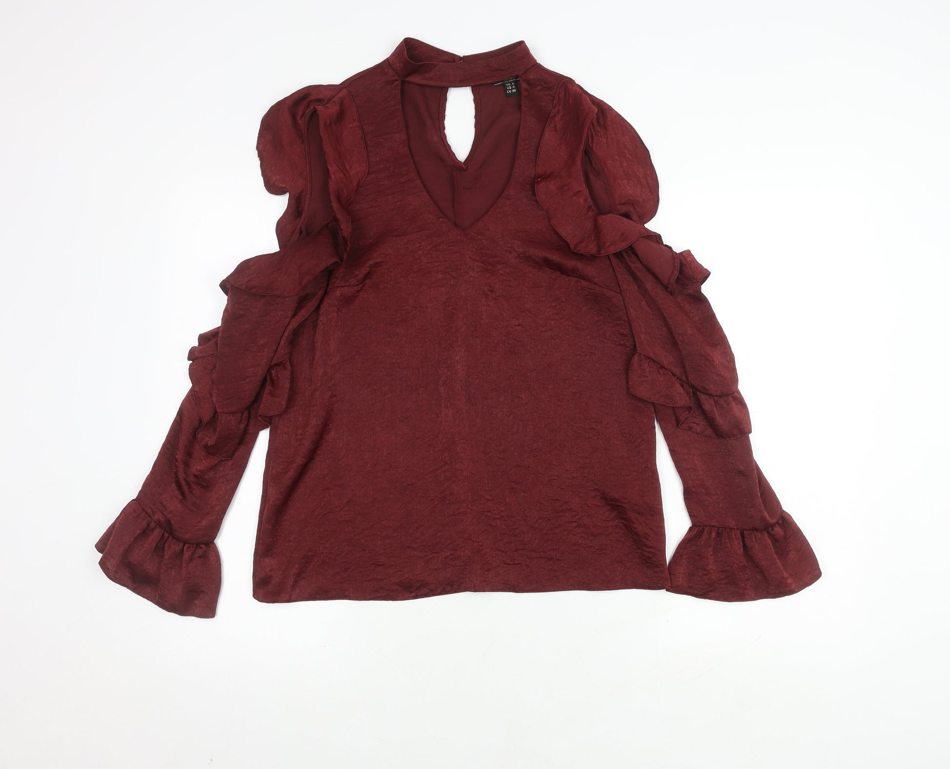 This elegant red Lipsy blouse is perfect for adding a touch of sophistication to any wardrobe. Made from 100% polyester, it offers both comfort and style. The long, ruffle-accented sleeves and V-neck wrap style make it ideal for parties or cocktail events. Its solid red colour ensures it stands out, while the regular fit and size 8 cut provide a flattering silhouette. Suitable for autumn and spring evenings, this blouse can easily transition from business casual to evening chic. In excellent condition with no visible defects, this blouse is a versatile addition to any fashion-forward collection.