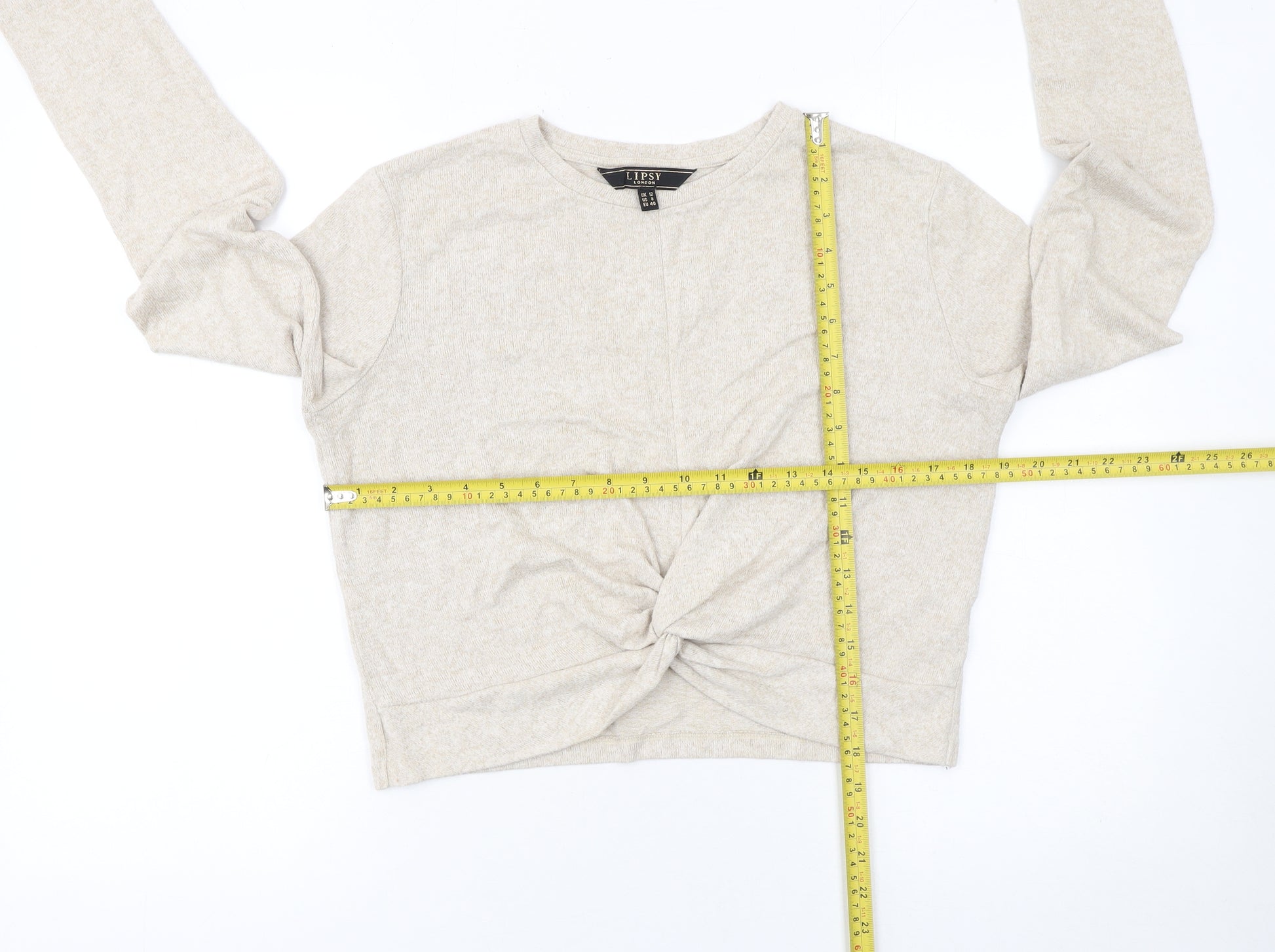 Step out in effortless style with this elegant beige twist front jumper from Lipsy London. Crafted in a beautifully soft knitted fabric, this women's pullover jumper provides both comfort and a flattering silhouette. The understated crew neckline and chic twist detail at the front elevate it beyond the everyday, making it perfect for pairing with jeans, trousers, or skirts. Designed in a fine, tight-knit construction with long sleeves, it’s a versatile piece ideal for layering during cooler months or wearing on its own through transitional weather. Composed of a blend of viscose, polyester, and elastane, the jumper offers a gentle stretch for comfortable movement while maintaining a smooth and flattering fit. Its warm beige tone adds timeless sophistication, suitable for both smart-casual and relaxed settings. This Lipsy jumper is an excellent choice for autumn, winter, and early spring wear, giving you a cosy yet sleek wardrobe staple. In excellent pre-owned condition with no visible flaws, it’s ready to become a stylish addition to your wardrobe. Machine washable for easy care, this jumper is perfect for everyday elegance and can transition seamlessly from day to evening wear. Whether you’re dressing for a casual day out, an evening catch-up, or a comfortable day at work, the Lipsy beige knit jumper combines simplicity and fashion-forward design to ensure you look effortlessly polished.