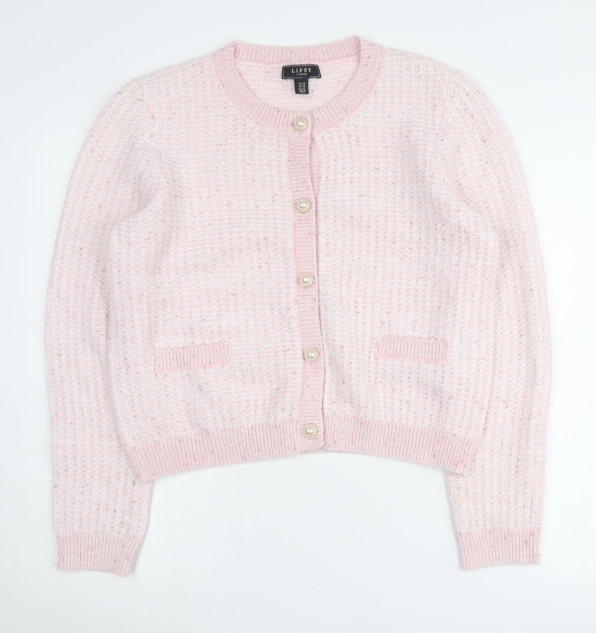 Step out in style with this elegant Lipsy Women's Cardigan in a charming shade of pink. Designed for comfort and chic appeal, this cardigan features a classic crew neck and a button front, making it a versatile addition to your wardrobe. Perfect for casual settings, this regular fit cardigan comes in size 14, catering to comfort and style on every wear. Crafted from a soft knit fabric, its open-knit style offers a lovely texture, complemented by accents of button details that enhance its overall appeal. Made with a blend of polyester, acrylic, and polyamide, this cardigan promises durability with a soft touch. Featuring long sleeves, it is ideal for providing a little warmth while staying fashionable. However, note a light stain on the sleeve, reflecting its previous gentle use. Nevertheless, it remains a lovely piece for everyday wear. Whether paired with jeans for a casual outing or styled with a skirt for a more polished look, this Lipsy cardigan adds a touch of elegance to your ensemble. Don't miss the chance to own this delightful addition that combines comfort, style, and affordable pricing.