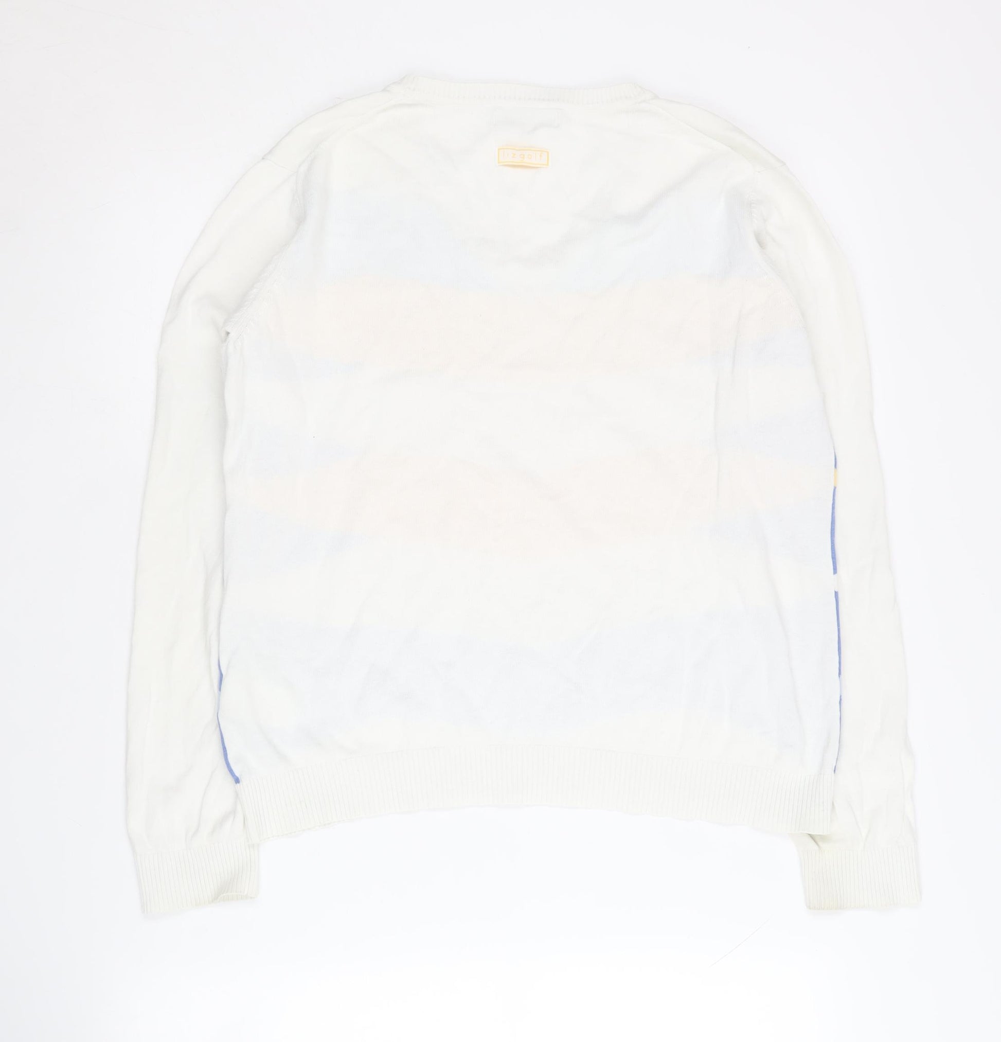 Brighten your wardrobe with this vibrant Liz Golf Women's Pullover Jumper, perfect for those seeking style and comfort. Featuring a striking multicoloured geometric pattern in lively shades, it brings a pop of colour to any outfit. Crafted from a soft knit blend, the jumper is composed of 97% cotton, ensuring breathability, while 2% polyamide and 1% elastane add stretch and durability, keeping you comfortable all day. The V-neckline provides a flattering touch, making it a versatile piece for layering or wearing alone. With long sleeves and a regular fit, this jumper is ideal for cooler weather, offering both warmth and style. Ideal for casual outings or adding flair to your everyday wardrobe, its excellent condition guarantees longevity, ensuring you look chic season after season. Available in size L, it's designed to fit regular sizes comfortably. Whether pairing with jeans for a relaxed look or dressing it up with a skirt, this jumper is your go-to choice for effortless fashion. Grab yours while you can and add a splash of youthful energy to your collection!