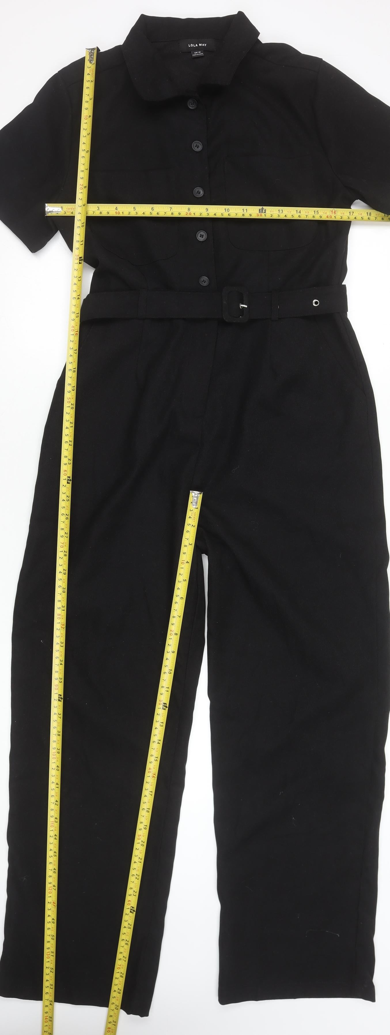 Step out in confident contemporary style with this black collared jumpsuit from Lola May. Expertly crafted in a soft woven 100% polyester fabric, this one-piece is both durable and lightweight, making it the ideal choice for everyday wear or casual outings. The short sleeves and button-front fastening offer a touch of structure, while the straight-leg design ensures comfort and versatility throughout the day. Designed with a matching fabric belt to cinch at the waist for a flattering silhouette, this jumpsuit combines minimalist elegance with practical detailing. The collared neckline and practical pockets add sophistication and ease, keeping the look polished and relaxed in equal measure. Perfect for transitional seasons such as spring, summer, and autumn, this timeless piece can be styled up with statement accessories and heels or dressed down with trainers for effortless daywear. Its classic black tone makes it a wardrobe staple that pairs effortlessly with any outfit combination. The Lola May jumpsuit in UK size 12 delivers a comfortable regular fit, suitable for women who value style and simplicity. This garment is easy to maintain, being machine washable at 30°C, and retains its smooth, wrinkle-resistant finish, keeping your look sharp with minimal effort. Whether worn for casual social events, weekday styling, or relaxed evenings out, its understated shape and tailored cut make it an incredibly versatile wardrobe essential. Clean lines, practical buttons, and a refined belt detail all contribute to a smart yet laid-back aesthetic that can easily adapt across seasons. With its subtle design touches and flattering proportions, this black jumpsuit is an elegant and versatile choice for modern women who appreciate comfort with style. Ready to wear and easy to pair, it captures the effortless charm of Lola May's contemporary tailoring. An excellent pre-loved find ready to refresh your collection.