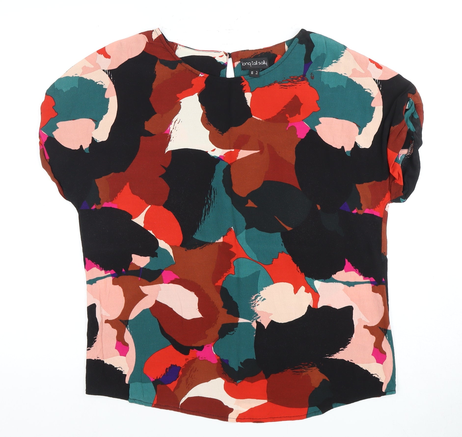 Enhance your wardrobe with this stunning women's blouse from Long Tall Sally, designed to make a bold statement. This vibrant multicoloured piece is a perfect blend of style and comfort, ideal for turning heads in any setting. Crafted entirely from high-quality polyester, this blouse ensures both durability and a soft, comfortable feel against the skin. The abstract pattern introduces a splash of colour and creativity, making it a versatile addition to various ensembles. Featuring a sleek round neckline and chic cap sleeves, this blouse delivers an effortless elegance, suitable for both casual outings and more sophisticated occasions. The discreet button closure at the back adds a touch of functionality while maintaining the garment's overall stylish aesthetic. In excellent condition with no visible defects, this blouse assures premium quality. Its eye-catching design and immaculate detailing make it a must-have for fashion-forward women. Grab this opportunity to own a piece that not only complements your style but elevates it. Perfect for women who appreciate contemporary fashion blended with unique design elements.