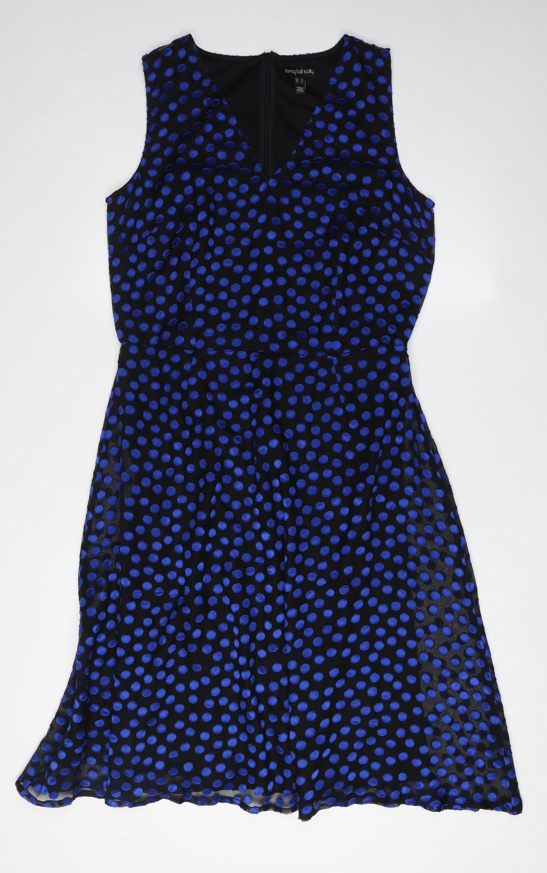 Enhance your wardrobe with this elegant Long Tall Sally dress in a striking black and blue polka dot pattern. Designed for women, this sleeveless dress offers a V-neckline that flatters the figure, adding a touch of elegance to your look. Crafted from 100% polyester, the woven fabric ensures durability while providing a lightweight, comfortable fit ideal for any season. This dress guarantees an eye-catching appearance at any event. Featuring a zip closure for easy wear, its regular size 14 fits beautifully, tailored for a sophisticated style without compromising comfort. Perfect for women seeking both style and versatility, this dress transitions effortlessly from day to night. Pair it with heels and statement jewellery for an elegant evening out, or keep it chic with sandals and a clutch for a casual daytime outing. Embodying a classic design with a modern twist, this new-with-tags dress is ready to make its mark in any wardrobe.