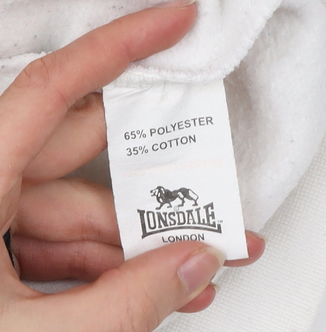 This Lonsdale London boys’ sweatshirt in classic white is a comfortable and stylish casual pullover ideal for everyday wear, whether for school, lounging, or outdoor activities. Designed in a regular fit, it offers both flexibility and comfort, making it a must-have addition to any boy’s wardrobe. With its crew neckline, this sweatshirt delivers a timeless athletic look paired with the bold Lonsdale logo across the chest, instantly recognisable and associated with sporty, active lifestyles. The black stripe detail along the sleeves adds a contrasting accent, enhancing the sweatshirt’s casual aesthetic and giving it a sporty edge.Crafted from a soft blend of 65% polyester and 35% cotton fleece, this sweatshirt provides the ideal balance of durability, warmth and softness. The breathable fabric blend ensures comfort across the seasons, while being machine washable makes care simple and practical for busy parents. Its pullover design and long sleeves offer easy wear and reliable coverage during cooler months, making it perfect for autumn, winter and spring wear.This sweatshirt shows signs of wear, with some staining on the cuffs and sleeves as well as light discolouration to the fabric, placing it in ‘Good’ used condition. Despite this, it remains a quality Lonsdale piece built for comfort and casual sporty style. Suitable for boys aged 11-12 years, this regular-fit sweatshirt is versatile and works well with jeans, joggers, or shorts for a cool everyday outfit. It’s a reliable and affordable choice for parents seeking branded casual wear that balances comfort, durability, and iconic design.Overall, this Lonsdale sweatshirt is an excellent wardrobe staple for any active boy. Its classic pullover style, soft fleece fabric, and bold logo design provide both comfort and confidence, making it a practical choice for day-to-day use.