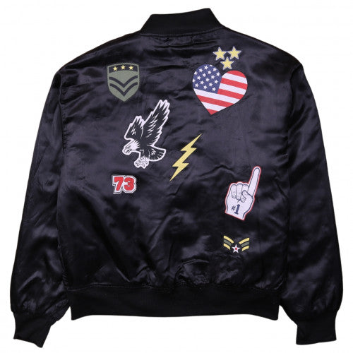 Add a touch of bold, effortless style to your wardrobe with this black bomber jacket by Love Tribe. Designed for women, this jacket is made from 100% polyester with a glossy satin finish, offering both comfort and durability. The short, bomber-style cut gives it a trendy streetwear vibe, while the ribbed cuffs, collar, and waistband ensure a snug, flattering fit. A full front zip makes it easy to wear, and the practical pockets lend functionality to the statement design. The front features a military-inspired embroidered badge, and the back showcases a collection of eye-catching patches — including patriotic and graphic motifs like stars, lightning bolts, and an eagle emblem that highlight individuality and youthful energy. These accents make it ideal for those who love expressive, American-inspired street fashion. The polyester lining provides added comfort, making it perfect for layering during spring and autumn seasons.This Love Tribe bomber jacket is perfect for casual occasions, pairing effortlessly with jeans, skirts, or joggers. Whether you’re dressing down for a weekend outing or adding a bold accent to your everyday look, it adds personality and edge to your ensemble. The durable, easy-care fabric ensures it remains a lasting favourite in your collection. Conditioned in excellent pre-owned state with only minimal signs of wear, it represents great value and enduring style for your wardrobe.