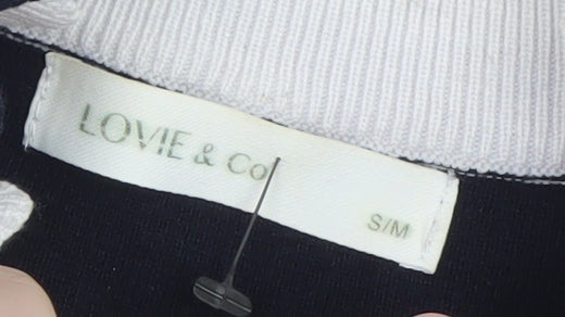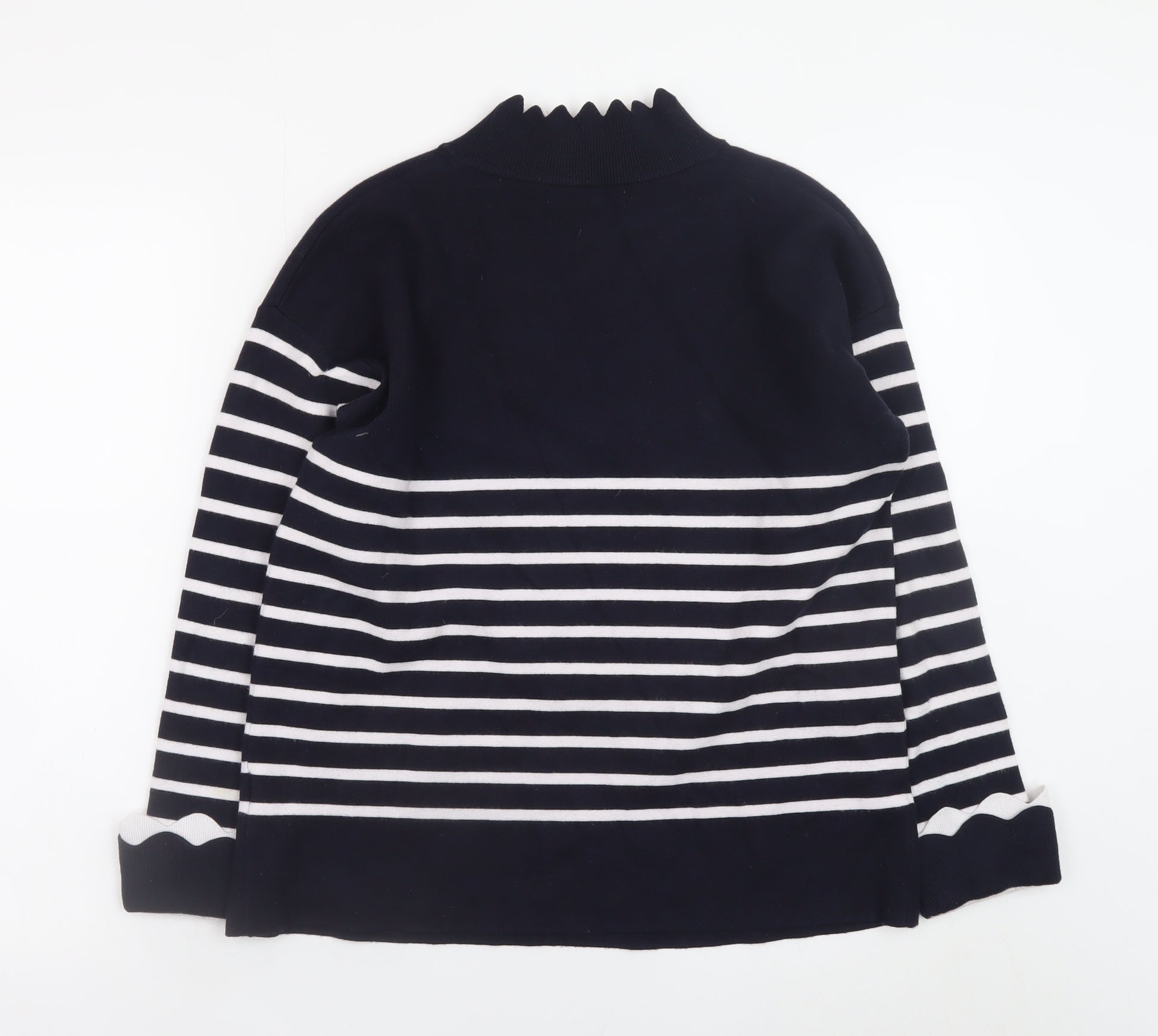Add a refined touch to your cool-weather wardrobe with this Lovie & Co women’s striped jumper. Beautifully designed in navy blue with white horizontal stripes, this mock neck pullover brings together modern chic and classic nautical style. The scalloped edge details at the neckline and cuffs give a playful yet elegant flair, perfect for creating a timeless casual look. Crafted from a soft, lightweight knit blend of viscose, polyamide, and polyester, this jumper offers breathability with just the right amount of stretch for all-day comfort. The regular fit and long sleeves make it a versatile piece suited for layering under jackets or pairing with jeans or skirts for a polished everyday outfit. Ideal for autumn, winter, or even breezy spring days, it strikes the right balance between cosy and stylish. Whether worn for an office-casual look, weekend outing, or travel, this jumper is both practical and fashionable. The overall condition is very good with only light signs of wear and no visible flaws. Lovie & Co’s attention to detail and quality construction ensure this knitwear maintains its shape and softness. The chic navy palette flatters all complexions and blends beautifully with neutral or bright colours alike. Create a classic maritime-inspired look or simply add sophistication to your daily rotation with this versatile and timeless striped mock neck jumper. Perfect for those who appreciate understated comfort with a stylish twist, it’s a wardrobe essential ready to elevate any outfit.