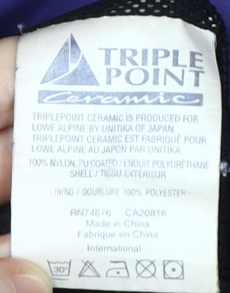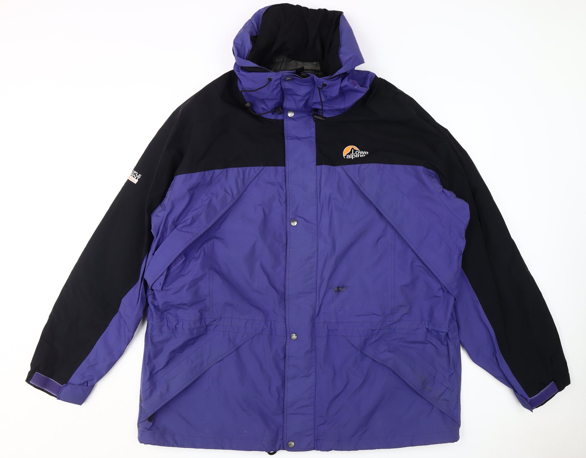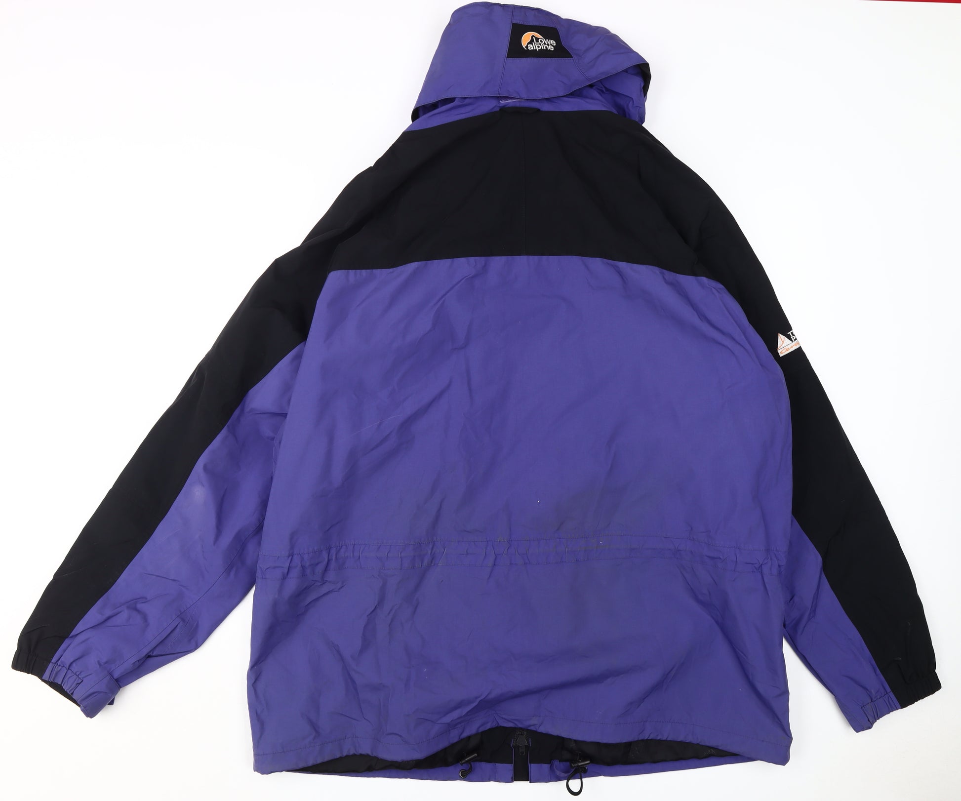 This Lowe Alpine jacket, styled in a striking purple and black combination, is perfect for the adventurous man seeking a reliable outerwear option. Tailored for men, this rain coat features a hooded design to provide excellent protection against unpredictable weather. Its waterproof and breathable nature, combined with a mid-length cut, ensures you stay dry and comfortable during your outdoor adventures. The jacket is crafted from durable nylon with a polyurethane coating, reflecting its quality and resilience against harsh elements.Ideal for autumn and winter seasons, this jacket supports casual and outdoor occasions flawlessly. It is a superb choice for activities like hiking, with its comfortable regular fit accommodating layers underneath without compromising on style or ease of movement. The jacket’s clean design is complemented by a logo accent and practical closure options using a zip and button mechanism, guaranteeing a secure fit.Despite being vintage, it remains in very good condition, showing minor marks from light wear, adding to its character without diminishing its functionality. The polyester lining ensures added warmth and coziness, making it a great addition to your outdoor gear. Machine washable for practical garment care, this jacket is as easy to maintain as it is to wear.Whether exploring the great outdoors or walking through urban jungles, this Lowe Alpine jacket delivers on performance and style. Grab this classic outdoor piece for a blend of functionality and timeless fashion, now available at a competitive price, ready to elevate your wardrobe essentials.