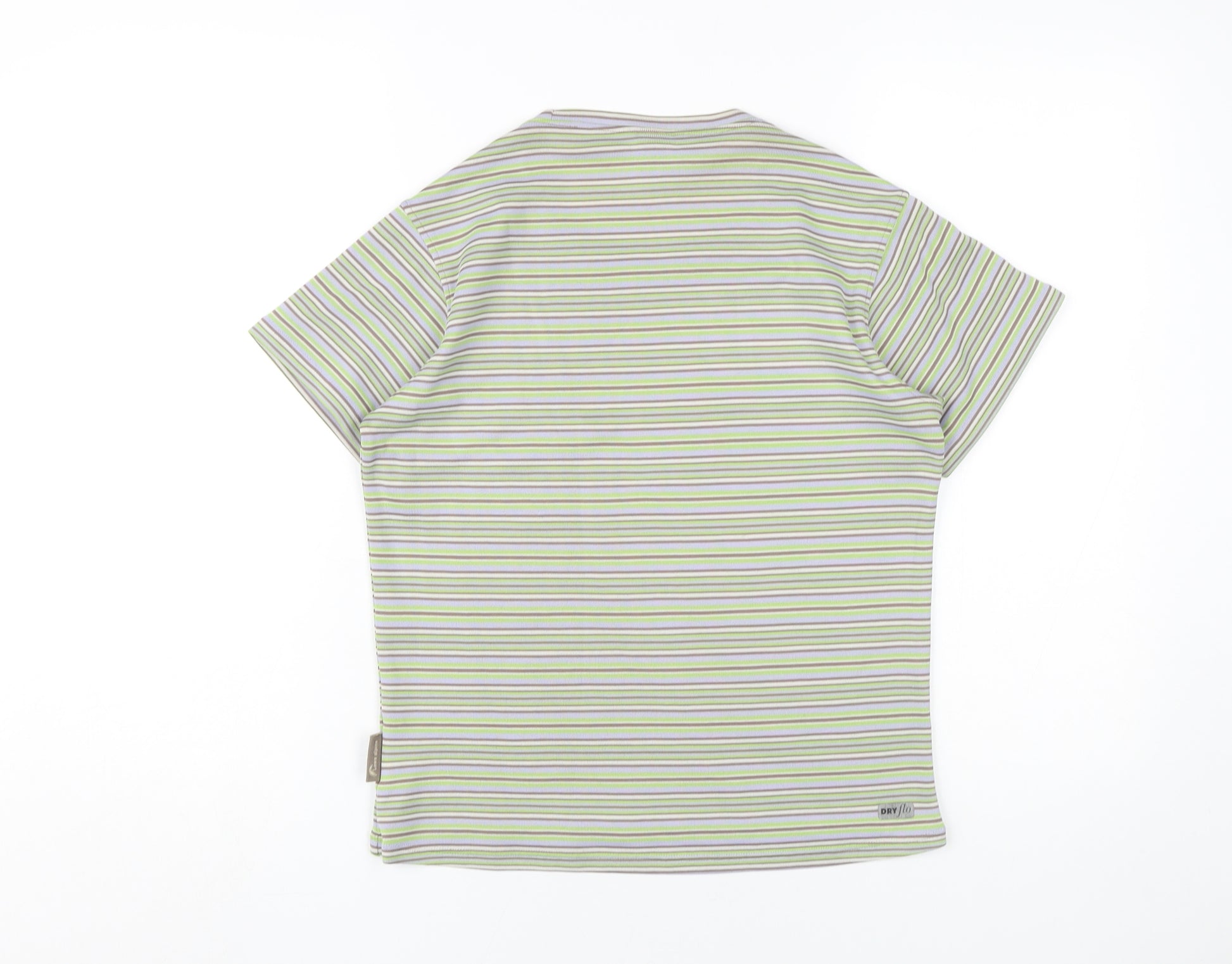 Elevate your casual wardrobe with this colourful and stylish Lowe Alpine T-shirt. Designed specifically for women, this petite size small shirt ensures a comfortable fit. The T-shirt features a classic crew neck and short sleeves, perfect for warm spring and summer days. Its vibrant multicoloured striped pattern adds a playful touch to any outfit, making it a versatile choice for various occasions.Crafted from a blend of polyester and elastane, this jersey-style top is both lightweight and breathable, ensuring all-day comfort. The fabric offers a slight stretch, providing ease of movement whether you're out for a walk or relaxing with friends. Its regular fit complements most body types, and its machine washable design makes it easy to care for.Although this T-shirt is in excellent condition with no visible wear, it does not come with original sales tags. It is an ideal choice for casual outings, vacations, or simply as a fashionable everyday piece in your wardrobe. Grab this Lowe Alpine T-shirt to enjoy a blend of quality, comfort, and style.