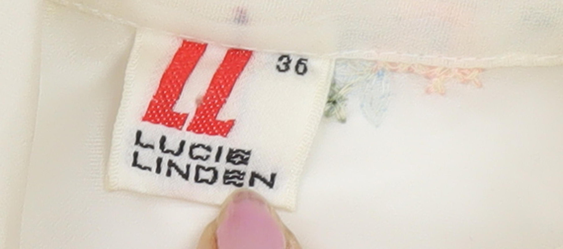 Step into a world of vintage elegance with this Lucie Linden Women's Ivory Floral Embroidered Blouse. Perfect for the sophisticated woman, this blouse captures the essence of timeless fashion with its delicate floral embroidery. Crafted for special occasions, it's ideal for party or cocktail settings where you want to make a subtle yet striking impression.This beautiful blouse comes in a classic ivory hue, setting a serene backdrop for the intricately embroidered floral patterns that add a touch of whimsy and charm. The design is completed with long sleeves and a collared neckline, exuding an aura of grace and poised femininity.The blouse is sized in UK 8, fitting perfectly for women who appreciate sophisticated fashion and fine details. Button closures run down the front, ensuring a snug fit. Although it is gently used, it remains in excellent condition with only slight signs of wear, enhancing its vintage appeal.Whether you're attending a garden party, wedding, or a cozy evening gathering, this blouse serves as the perfect canvas to reflect your style and grace. Pair it with a sleek pencil skirt or classic trousers, and accessorise with subtle jewellery to complete your look. Embrace its vintage allure and make a lasting impression.Given its unique characteristics and high-quality design, the blouse is priced attractively at £15.75. Secure this elegant piece today and add a touch of timeless fashion to your wardrobe.