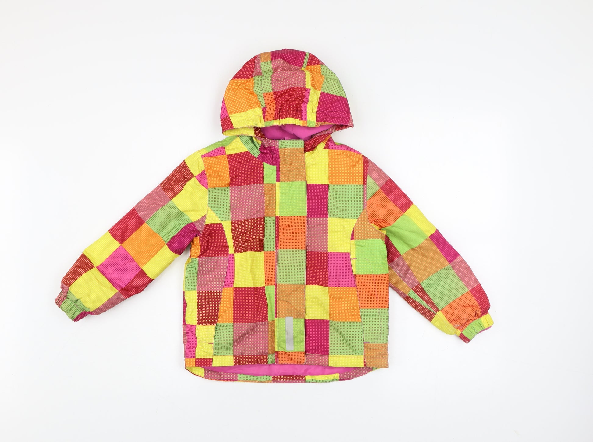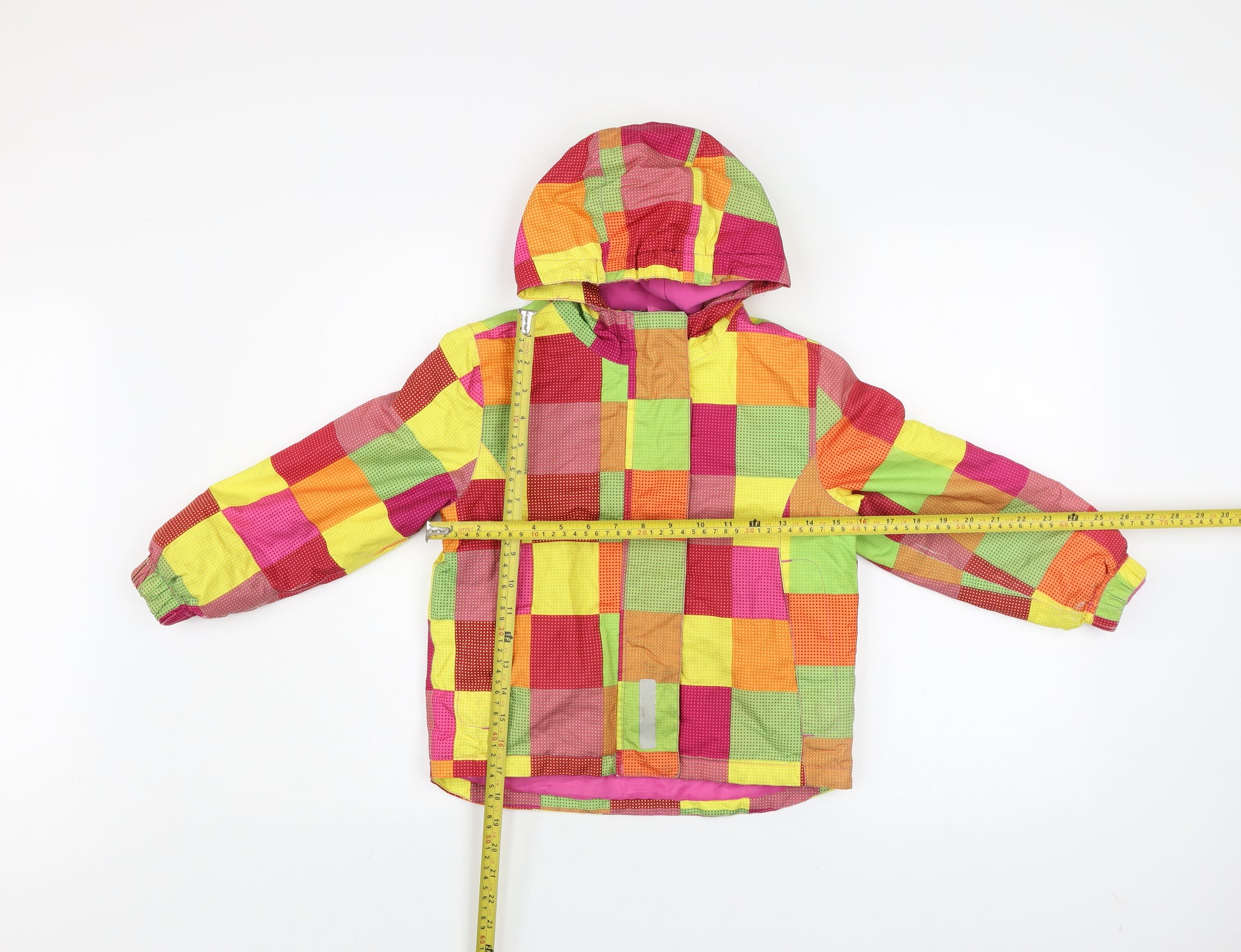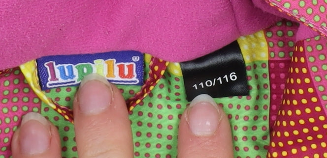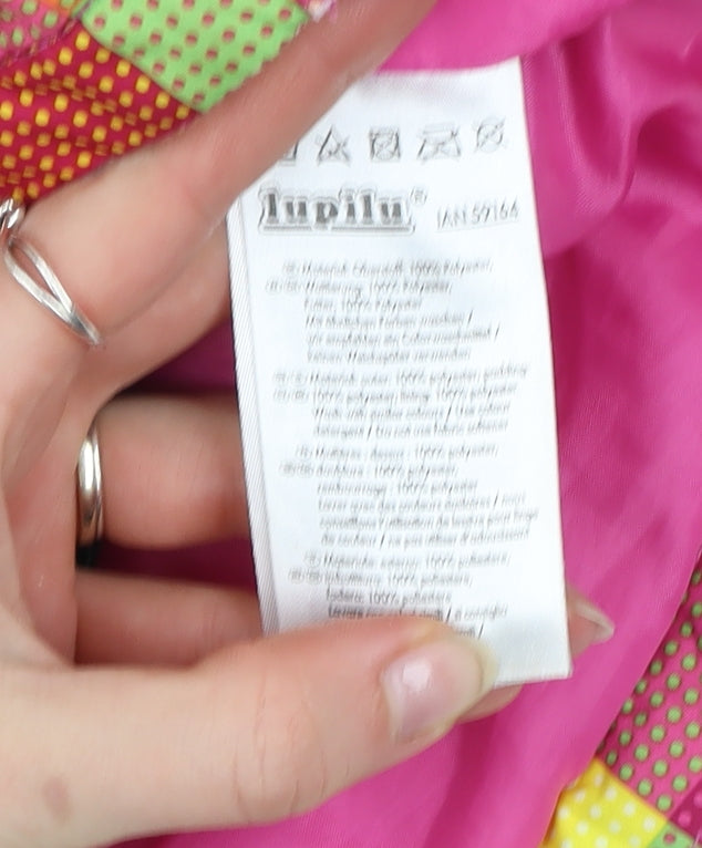 Brighten up your little one’s cold-weather wardrobe with this vibrant girls’ multicoloured check hooded puffer jacket from Lupilu. Designed for ages 5-6 years, this fun and practical winter jacket is made from durable 100% polyester to provide warmth, comfort, and protection during chilly days. The eye-catching patchwork check pattern in shades of pink, yellow, orange, green, and red brings cheerful character to any outfit, making it a playful addition to school and weekend wear alike.Constructed with a full front zip fastening and secure storm flap, the jacket delivers both practicality and ease of use. The hooded design and soft polyester lining ensure your child stays snug even in windy conditions, while two front pockets add a touch of convenience for little essentials. The polyester outer shell is water resistant, keeping your child comfortably dry from light rain or snow. Elastic cuffs help to seal in warmth, and the mid-length cut provides good coverage without restricting movement.Ideal for winter and autumn, this Lupilu jacket is perfect for school runs, playtime, or family adventures outdoors. Combining functionality with vivid colours, it represents great value and durability – a great option for parents seeking a blend of style and practicality. The jacket is machine washable, making it easy to keep clean for everyday wear.In excellent pre-owned condition with no visible marks or damage, this jacket maintains its original charm and bright finish, showing only minimal signs of use. With its vibrant design, reliable warmth, and everyday versatility, it’s sure to become a favourite choice for your child’s outerwear collection. Add a splash of colour and warmth to her wardrobe with this cheerful Lupilu check puffer jacket – a perfect blend of style, comfort, and practicality.