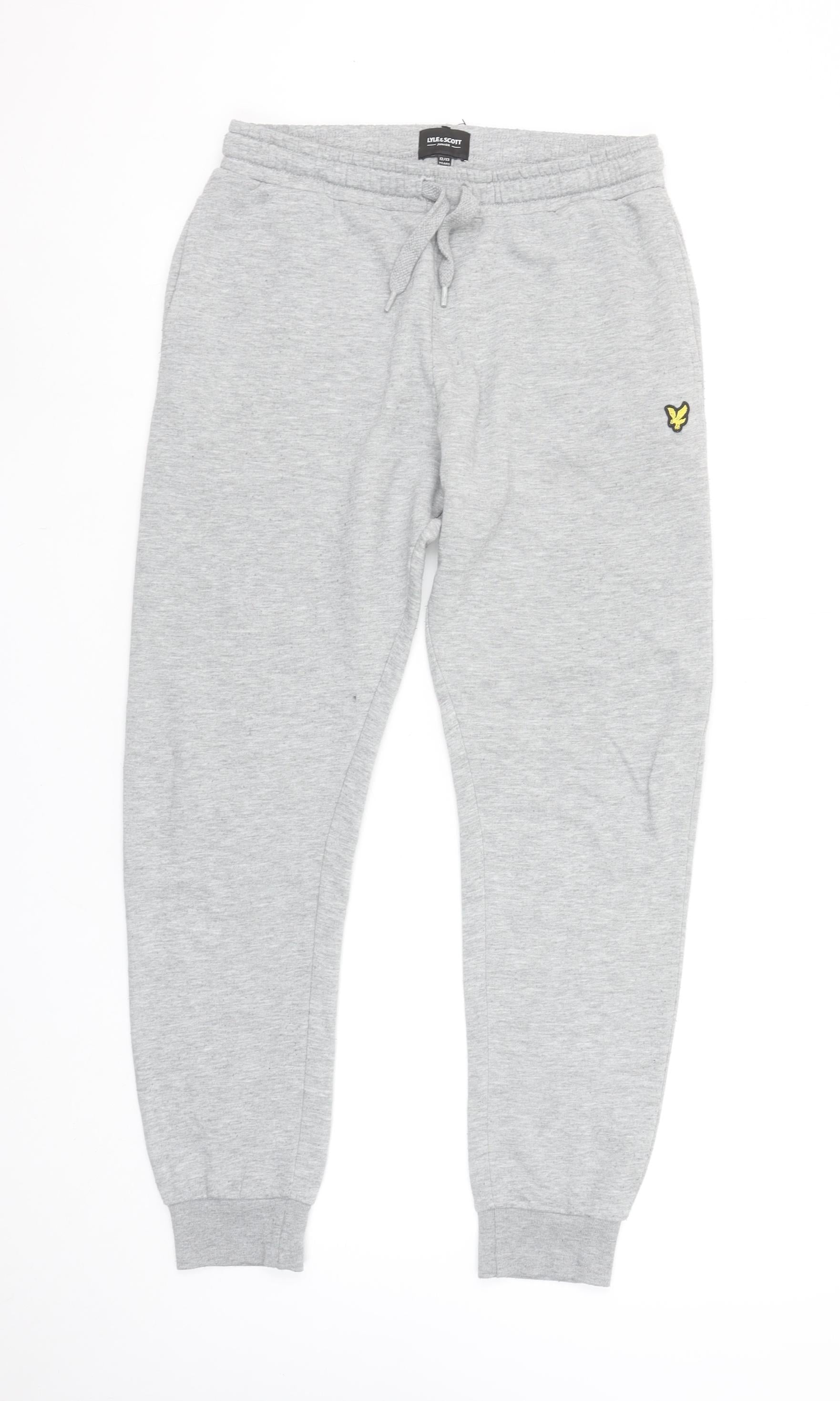 Keep your youngster comfortable and effortlessly stylish with these Lyle & Scott Boys Grey Jogger Trousers in size 12-13 Years. Crafted from a soft cotton and polyester blend, these joggers bring together durability and comfort, perfect for everyday wear. Made in a versatile heather grey shade, they feature the brand’s signature yellow eagle logo embroidered on the hip, adding a touch of classic style to a casual essential.The trousers come with an elasticated waistband and adjustable drawstring for a secure and comfortable fit, while the ribbed cuffs help maintain shape and provide a snug silhouette. Designed with practicality in mind, they include handy side pockets for small essentials and a rear pocket for added detail. The breathable and easy-care fabric makes them ideal for active boys, whether they're relaxing at home, heading to school, or spending weekends out and about.These joggers are suitable for cool-weather wear and transitional seasons, pairing effortlessly with hoodies, sweatshirts or casual tees. The soft jersey cotton fabric ensures warmth and comfort without being heavy, making them a great staple for any boy’s wardrobe. Machine washable and designed for long-lasting wear, they maintain quality and shape after multiple washes.In excellent pre-owned condition, these trousers show no signs of damage or stains, though they do not have original retail tags attached. Perfect for parents seeking a comfortable and stylish clothing option at great value, these Lyle & Scott joggers offer premium quality with everyday practicality.Add a touch of classic sporty charm to your child’s wardrobe with these iconic Lyle & Scott grey joggers – easy to style, soft against the skin, and ready for any casual occasion.