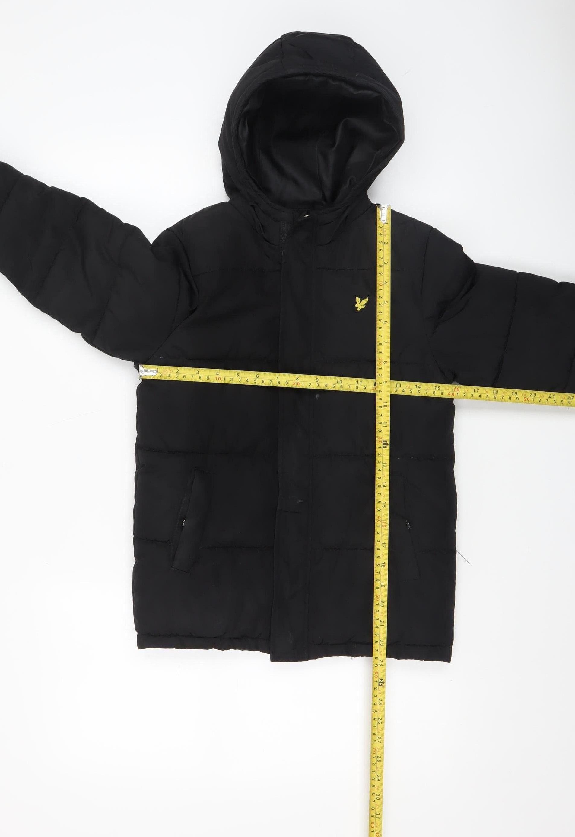 Keep your child warm and stylish this winter with this Lyle & Scott Junior hooded puffer jacket in classic black. Crafted from durable polyester with a soft padded lining, this coat provides excellent insulation while maintaining a lightweight feel. Designed for comfort and practicality, it features a full zip front for easy fastening, two front pockets for keeping hands warm, and a protective hood ideal for chilly or rainy weather. The quilted design adds a timeless touch, complemented by the signature Lyle & Scott logo embroidered in yellow on the chest, representing both quality and heritage. This mid-length jacket is perfect for everyday wear, whether for school, weekend outings, or winter walks. Its machine washable fabric ensures convenient care, making it a reliable addition to any young boy’s outerwear collection. With its sleek, modern cut and regular fit, it offers both functionality and fashion for active kids. The jacket is in very good pre-loved condition, showing only light signs of wear and no visible marks or flaws. Providing a blend of casual style and essential weather protection, this outerwear piece makes an excellent choice for the autumn and winter seasons. Ideal for parents seeking a high-quality, long-lasting jacket with trusted brand appeal. Grab this warm, hooded puffer at a great price before it’s gone!