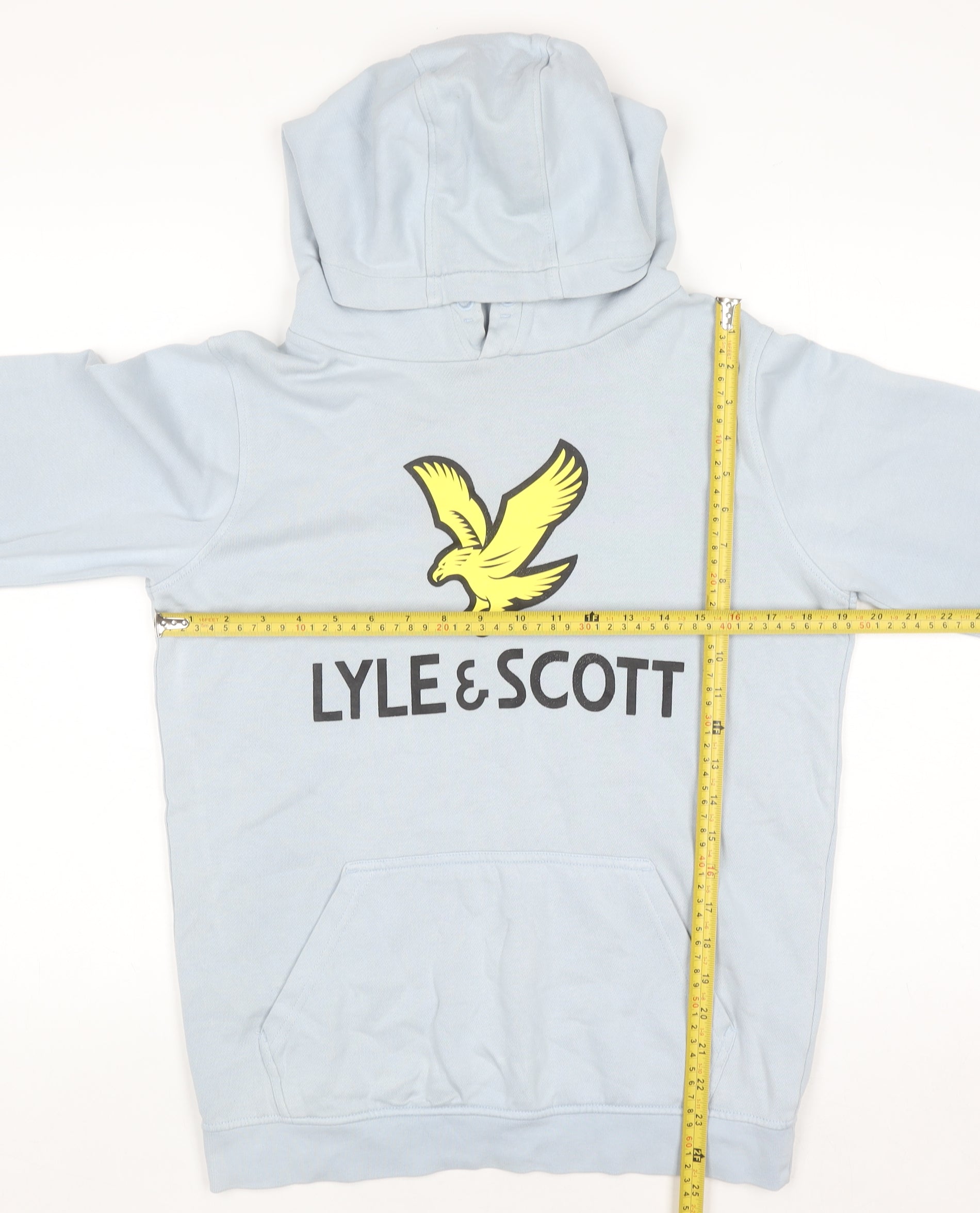 Upgrade your young one’s wardrobe with this iconic Lyle & Scott Junior Boys Pullover Hoodie in a stylish chambray blue shade. Designed in Great Britain, this versatile hoodie showcases the brand’s signature yellow eagle logo on the front, creating a standout yet classic look. Tailored for ages 14–15 years, it’s made from a soft and comfortable blend of 85% cotton and 15% polyester that ensures breathability and lasting comfort for daily wear. The hoodie is lightweight enough for layering while warm enough to wear on cooler days, making it ideal for autumn, winter, and spring seasons. Featuring a practical hood and a spacious front kangaroo pocket, it’s perfect for casual days out, school or lounging at home. The ribbed cuffs and hem provide a snug fit, maintaining shape and durability over time. With its clean design, soft knit texture, and iconic Lyle & Scott branding, this hoodie delivers both everyday comfort and premium style. Easy to care for, it’s machine washable and built to endure regular use. The relaxed fit ensures flexibility for movement, making it a great choice for active boys who value comfort as much as fashion. In excellent pre-owned condition, this hoodie shows minimal signs of wear and retains its original colour and graphic integrity, offering superb quality at a fantastic price. A perfect piece for any young trendsetter, this hoodie embodies smart-casual heritage and effortlessly complements jeans, joggers or shorts for a timeless, sporty aesthetic that reflects Lyle & Scott’s authentic British fashion legacy.