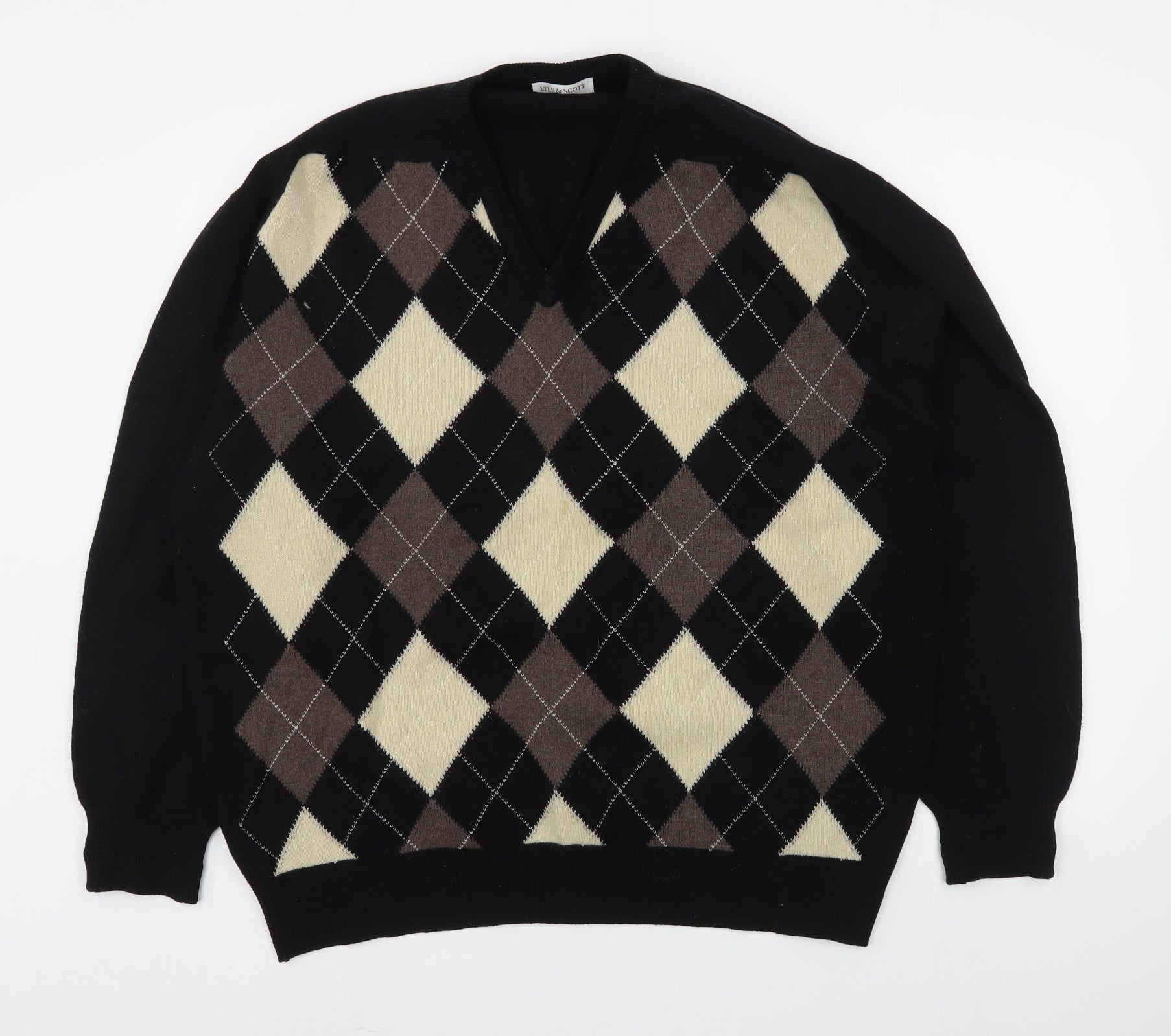 Mens Black V-Neck Argyle/Diamond Acrylic Pullover Jumper Size XL