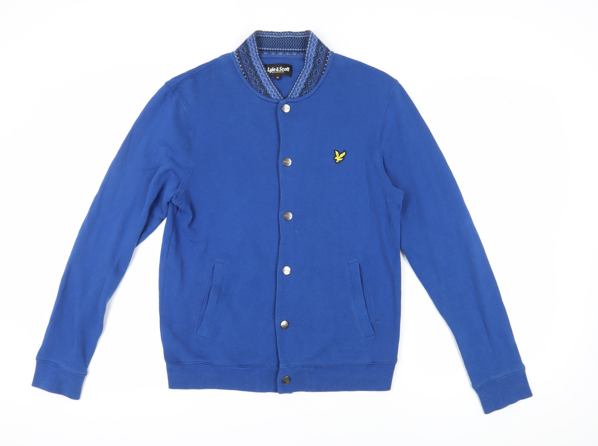 Discover the style and comfort of this Lyle & Scott men's blue cardigan sweatshirt. Crafted from 100% Cotton, this knit piece offers a regular fit to ensure relaxed wearability. Featuring a striking button and logo accents, this cardigan boasts a geometric pattern that adds a fashionable dynamic to any wardrobe. With a collared neckline and long sleeves, it's perfect for autumn, winter, and spring wear. Ideal for layering or pairing with casual jeans, the cardigan demonstrates a graphic print and functioning pockets for added practicality. Despite minor marks on the front, it's still in very good condition, making it a worthwhile addition to your wardrobe. Machine washable for easy care, this cardigan showcases the quality and timeless style associated with Lyle & Scott. Elevate your casual ensemble with this versatile layering piece.
